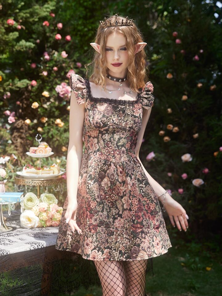 Fairycore فستان طباعة الأزهار مقلم بكشكش