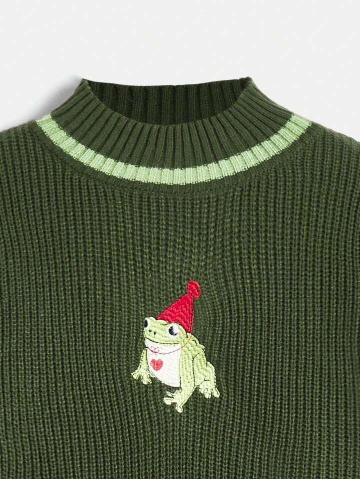 Fairycore كنزة صوف مطرز بضفدع مقلم متباين منخفض الاكتاف