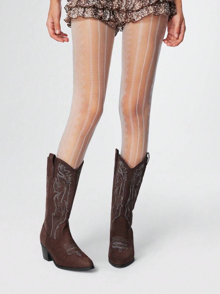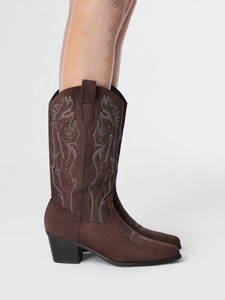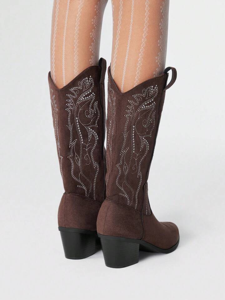 Fairycore بوت كاوبوي بني للسيدات، طراز جديد للربيع والخريف، من الجلد المدبوغ بتصميم رأس مدبب مطرز، بدون أربطة
