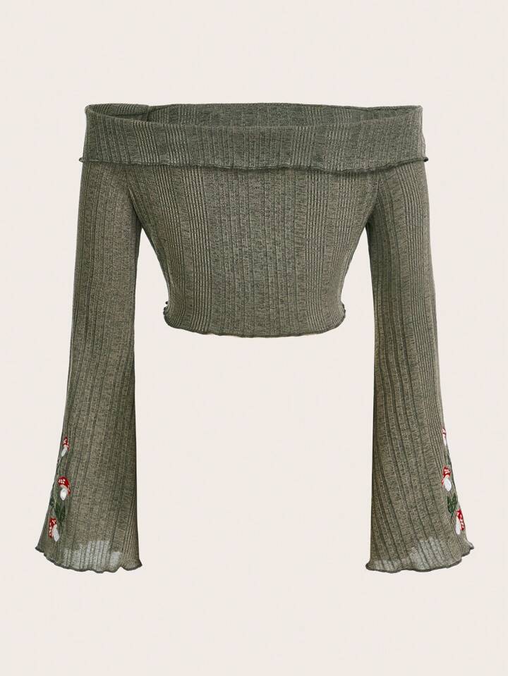 Fairycore تي شيرت مطرز بالفطر مكشوف الكتف مقلم نمط نبات الخس