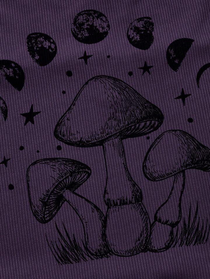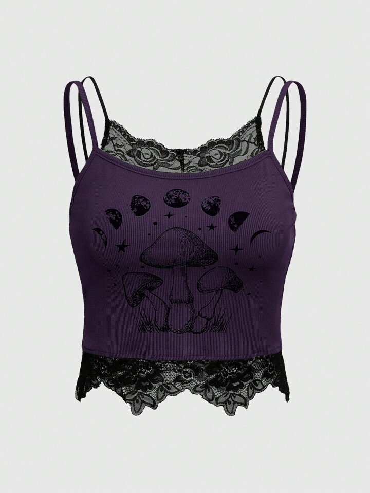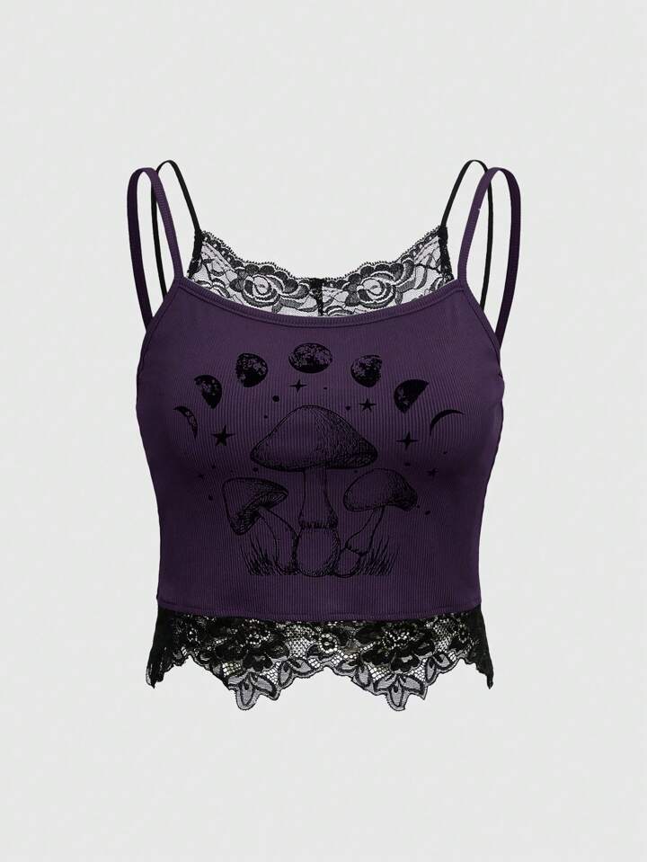 Fairycore بلوزة كامي دانتيل متباينة وطبعة مشروم