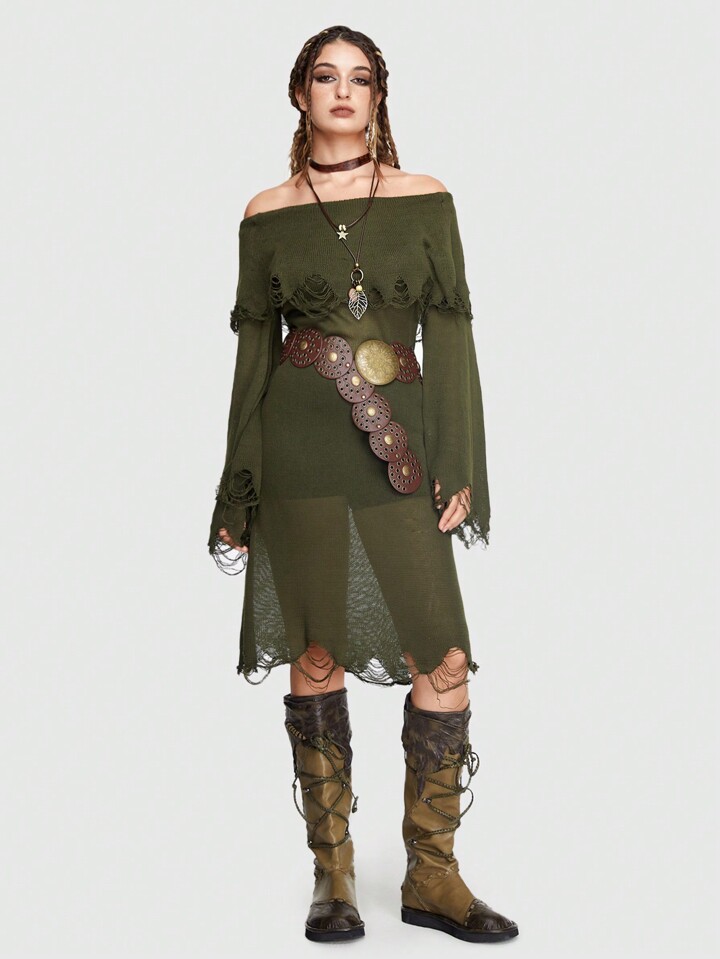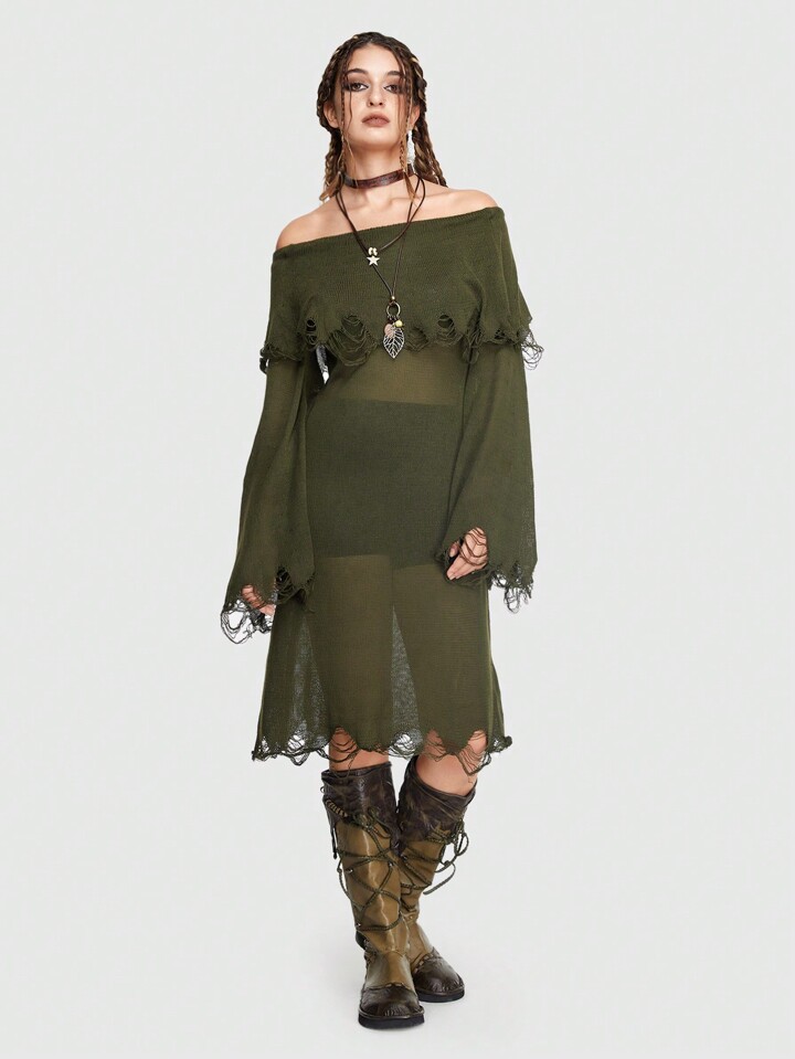 Fairycore فستان صوف مكشوف الكتف مقلم بكشكش اكمام واسعة بدون حزام