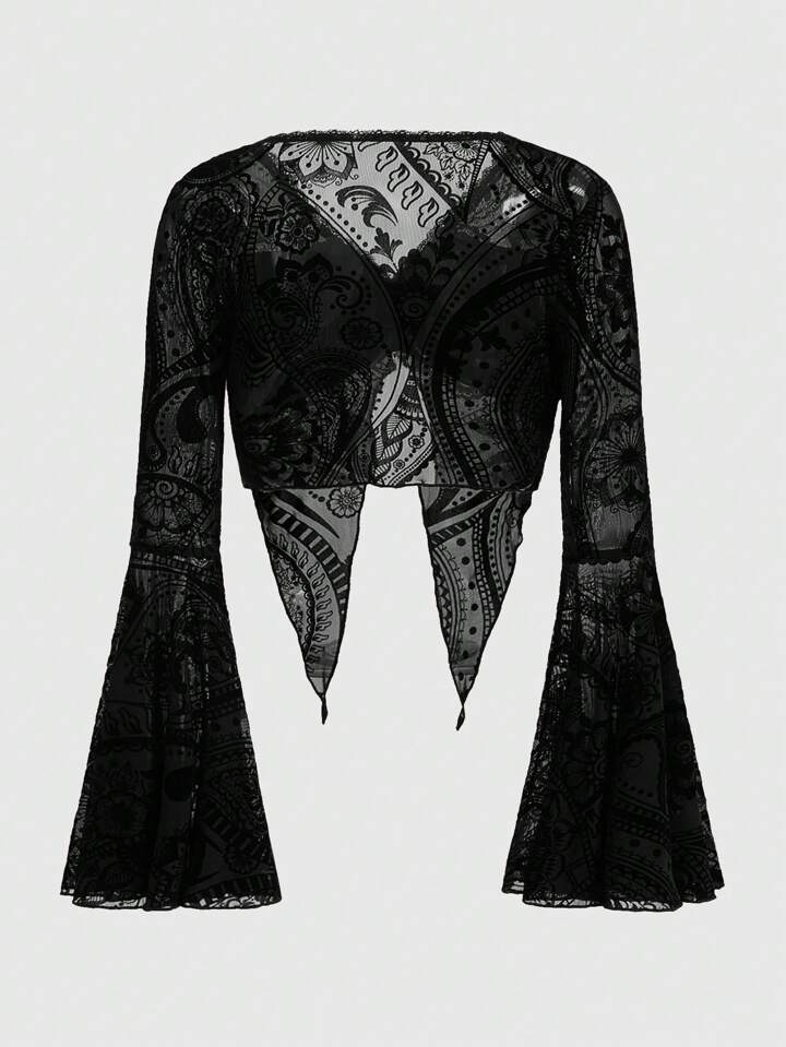 Fairycore لباس علوي طباعة بيزلي اكمام واسعة حافة غير متماثل شبكة
