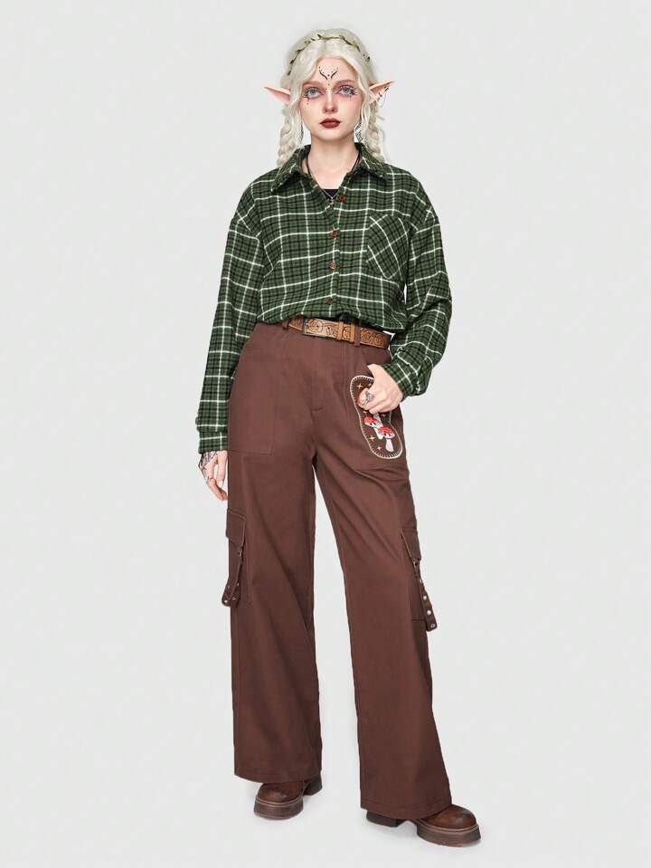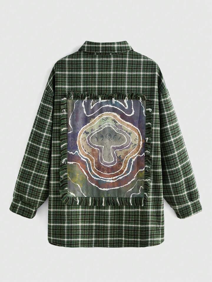 Fairycore معطف مربعات ملونة & جرافيك فطر منخفض الاكتاف مرقع جيب