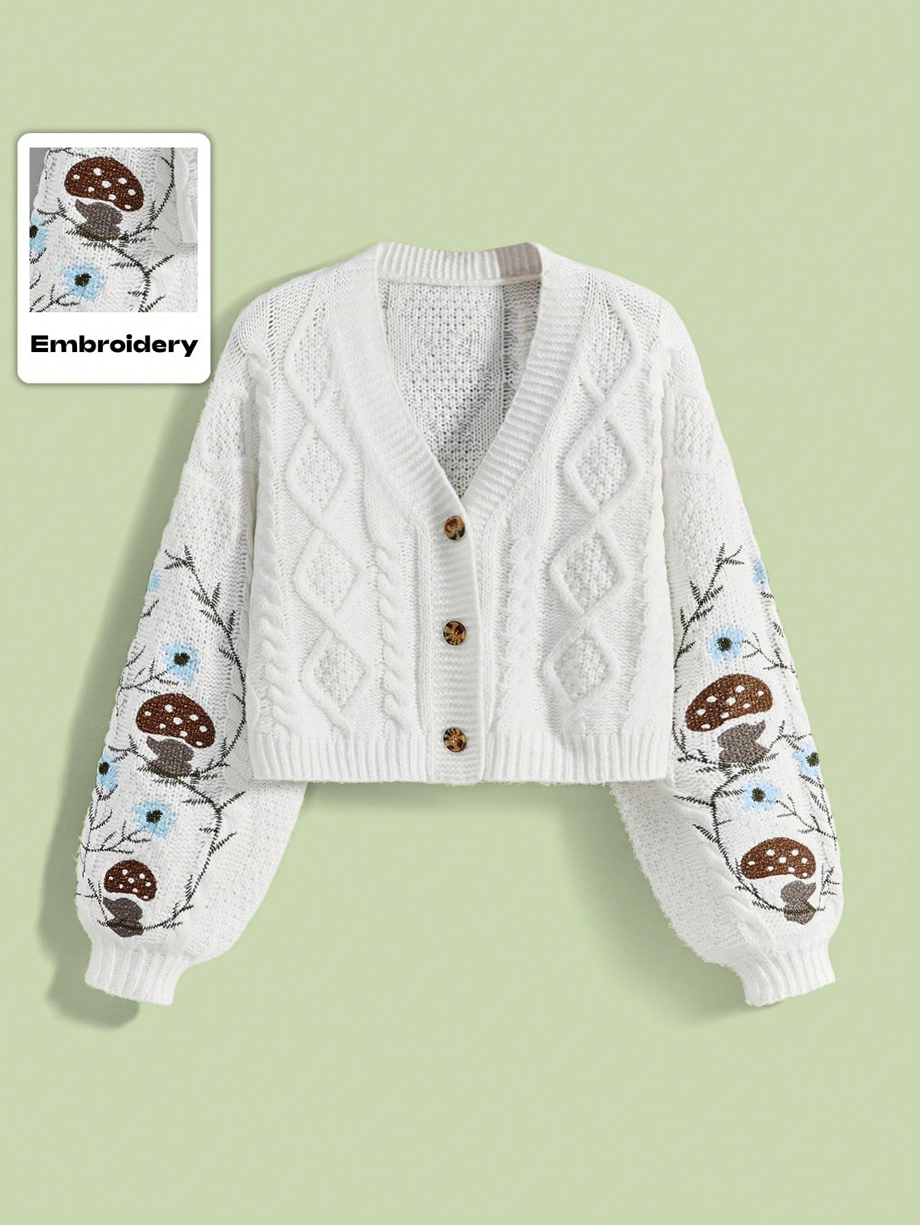 Fairycore كارديجان مطرز بالفطر والكرمة والأوراق، كارديجان محبوك أنيق لفتاة موري ذو مقاسات كبيرة للخريف والشتاء، كارديجان محبوك للخريف والشتاء للمرأة ذات المقاسات الكبيرة، كارديجان محبوك أبيض