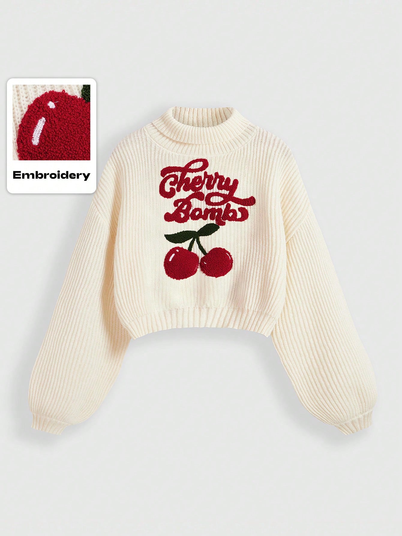 Fairycore بلوزة كنزة صوفية محبوكة مطرزة بنقشة الكرز وعنق عالي وأكمام فوانيس لطراز الفتاة مورياني للمرأة ذات الحجم الكبير، مناسبة للشتاء