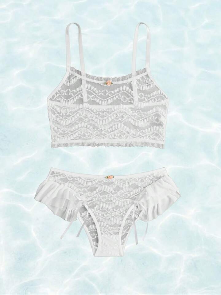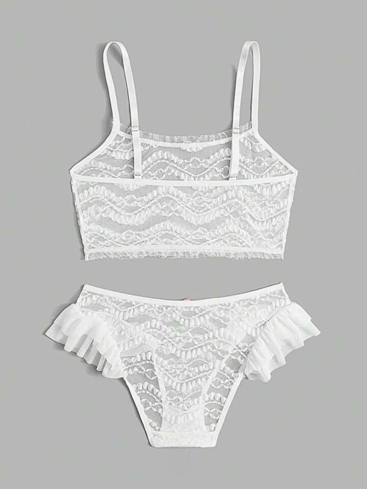 Fairycore طقم ملابس داخلية مقلم بكشكش دانتيل