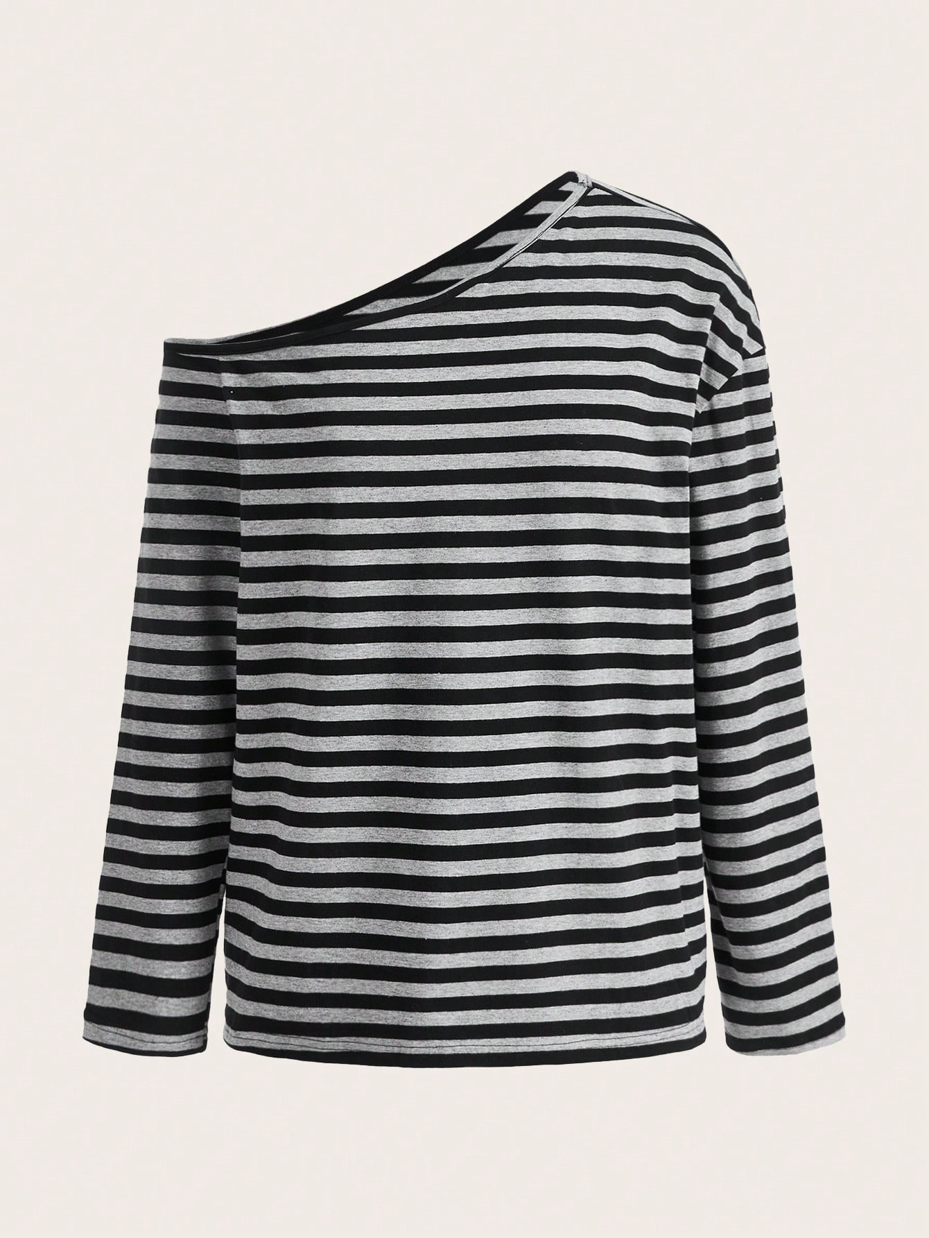 Fairycore تي شيرت طباعة مخطط ياقة غير متماثل