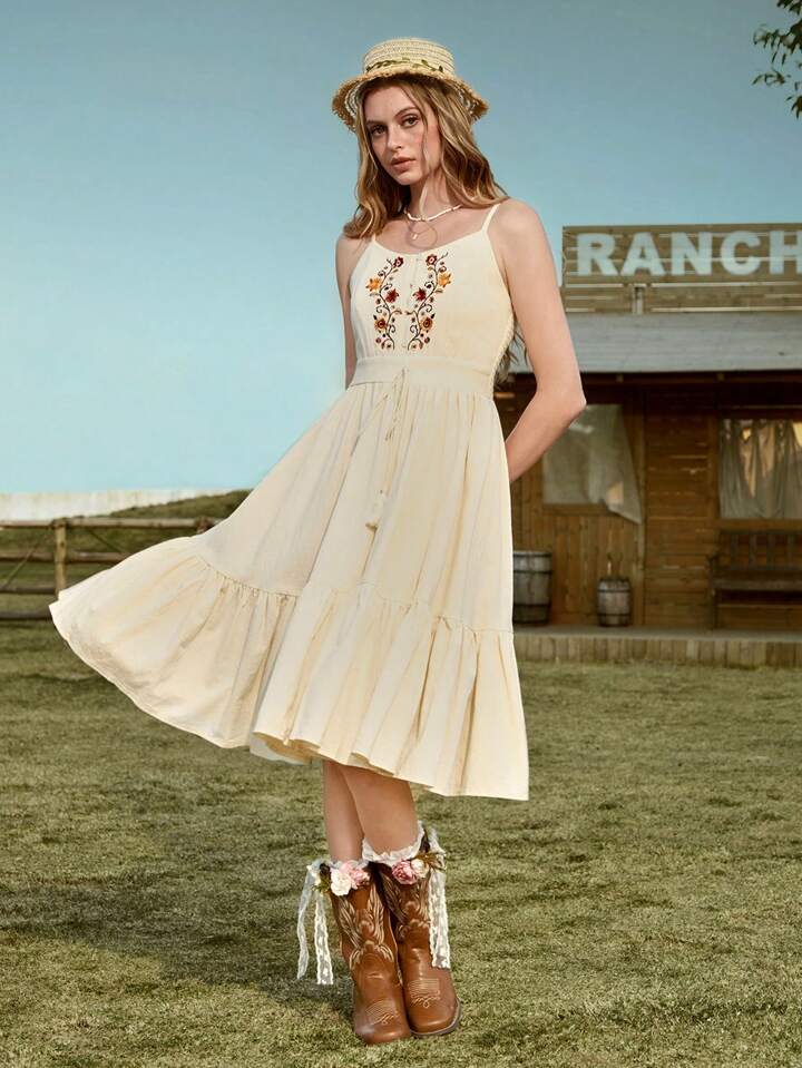Fairycore فستان زَلِق برباط خَيْطِي مطرز بطراز زهري قديم، ربيعي/صيفي