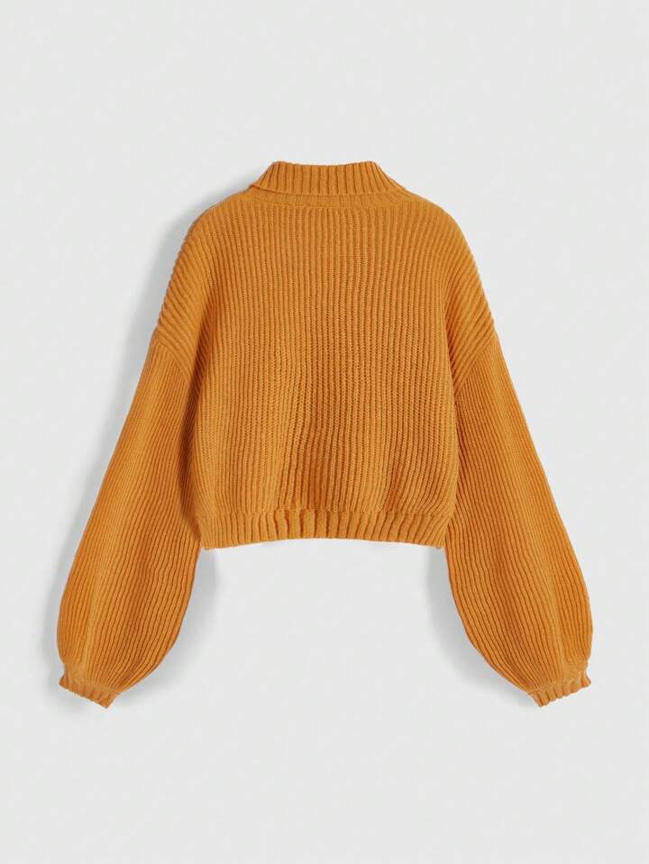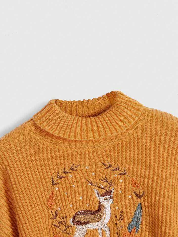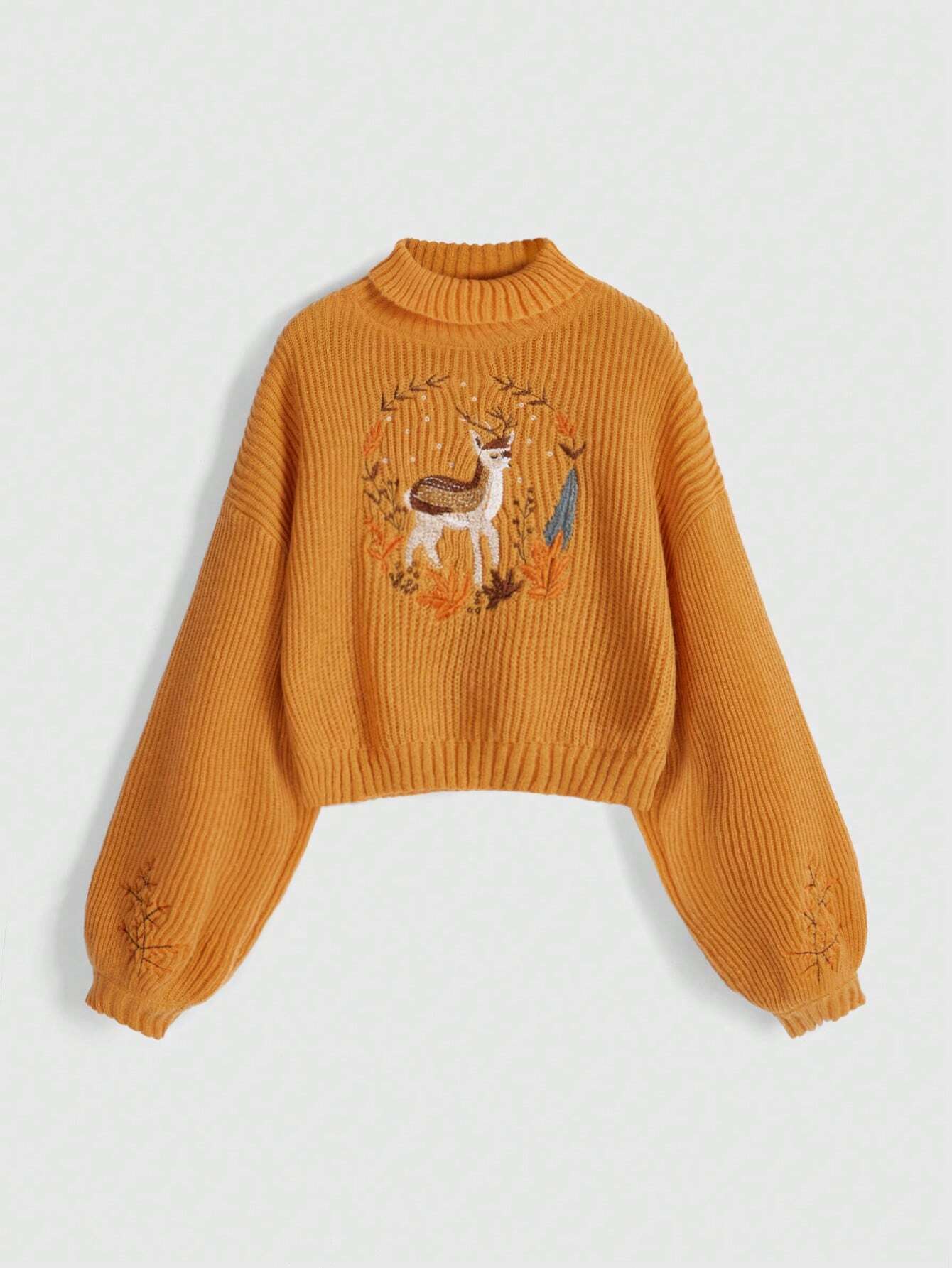 Fairycore كنزة صوفية قصيرة مفضضة بأكمام فانوس فضفاضة، طوق منقلب، بطبعات تطريز غزلان، رداء كاجوال يومي للخريف