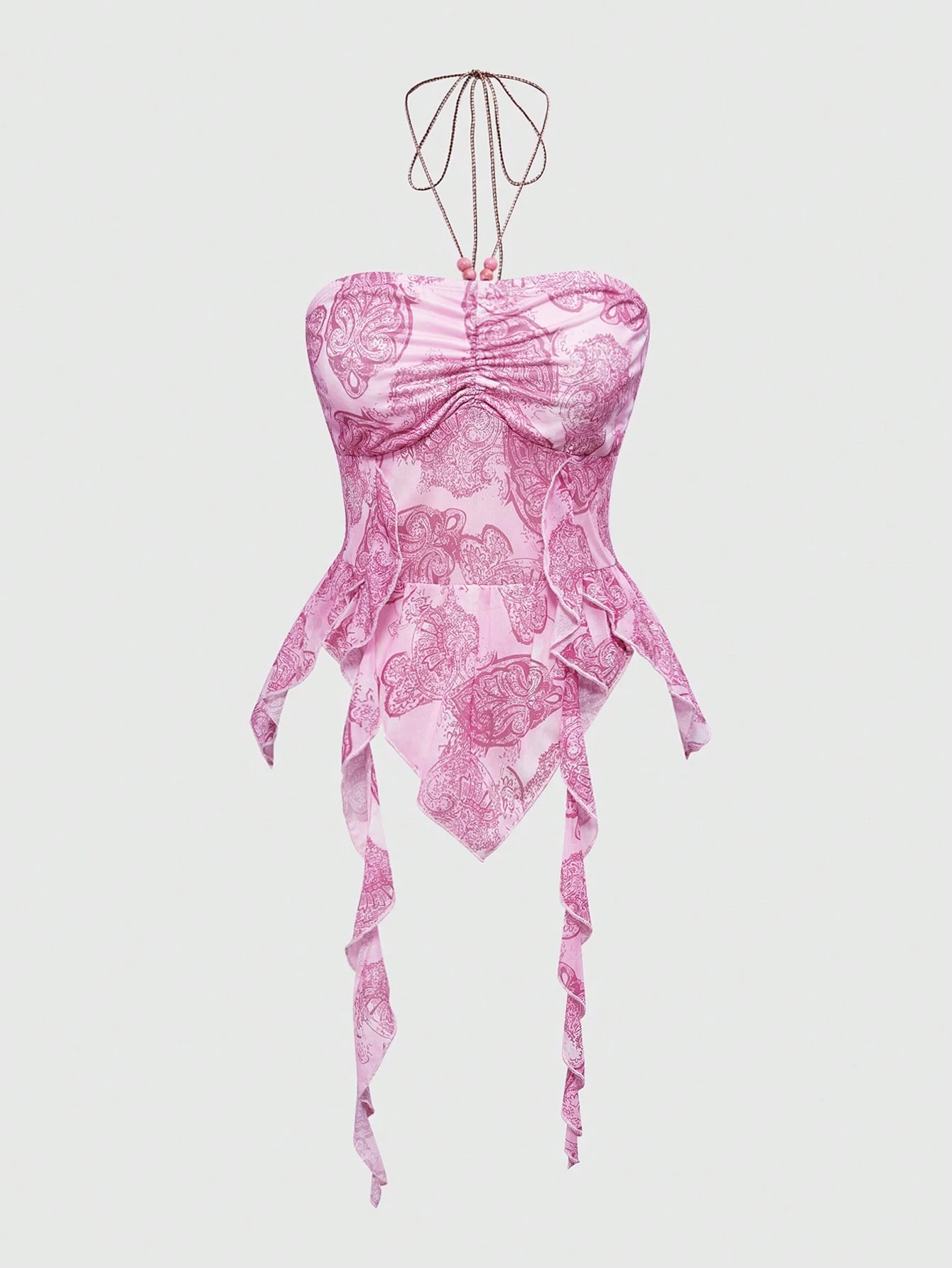 Fairycore ملابس علوية بلا أكمام بنمط البيزلي مع حاشية غير متماثلة للنساء