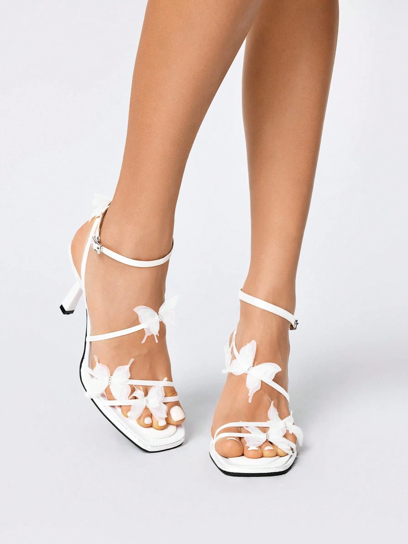 Fairycore أحذية نسائية بكعب عالي باللون الأبيض ، صنادل ذات فستان مفتوحة للأصابع بزخرفة فراشة للصيف ، شبشب بكعب رفيع