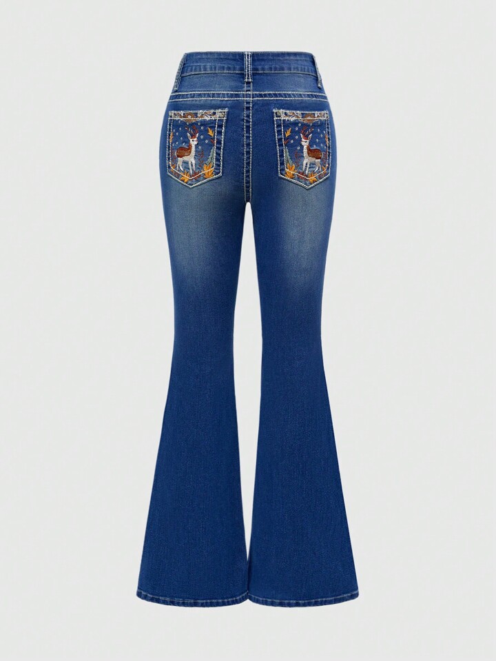 Fairycore بنطلون جينز للنساء مع تطريز على الجيب الخلفي بتصميم الغزلان والأوراق، للربيع/الصيف
