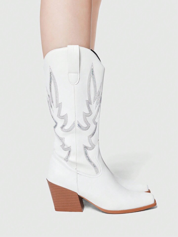 Fairycore بوت نسائي أنيق متناظر مطرز بالترتر على الطراز الغربي ، بوت جلدية جديدة متوسطة الكاحل للربيع والخريف