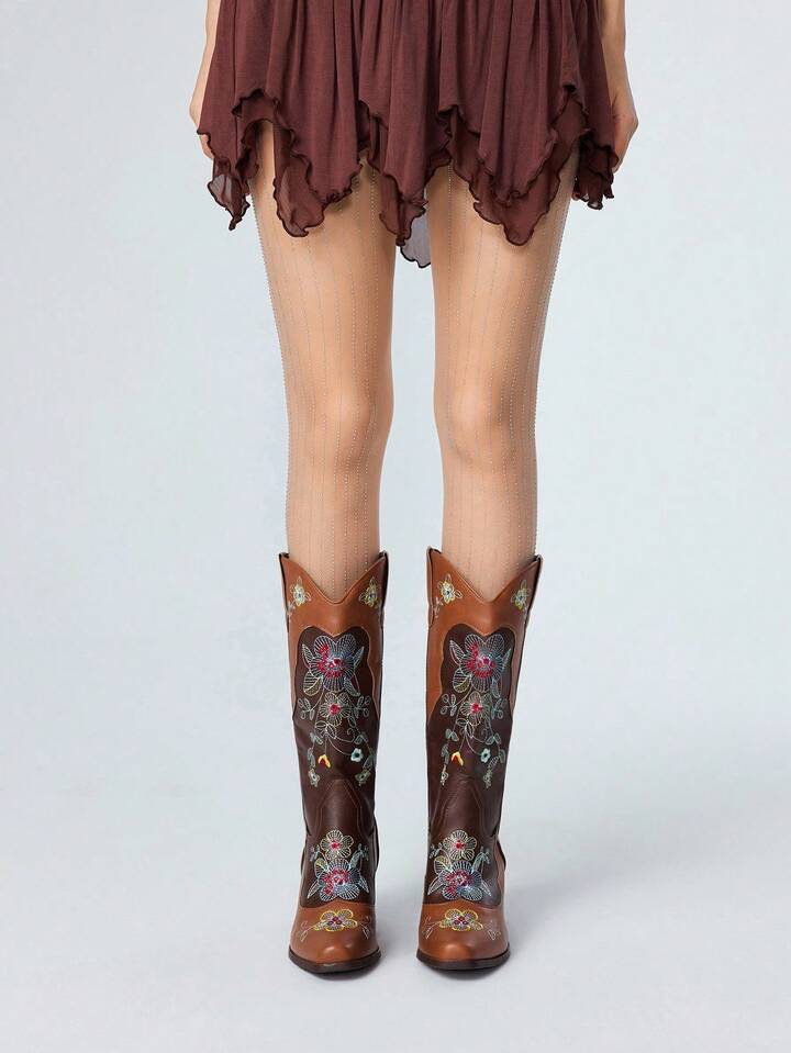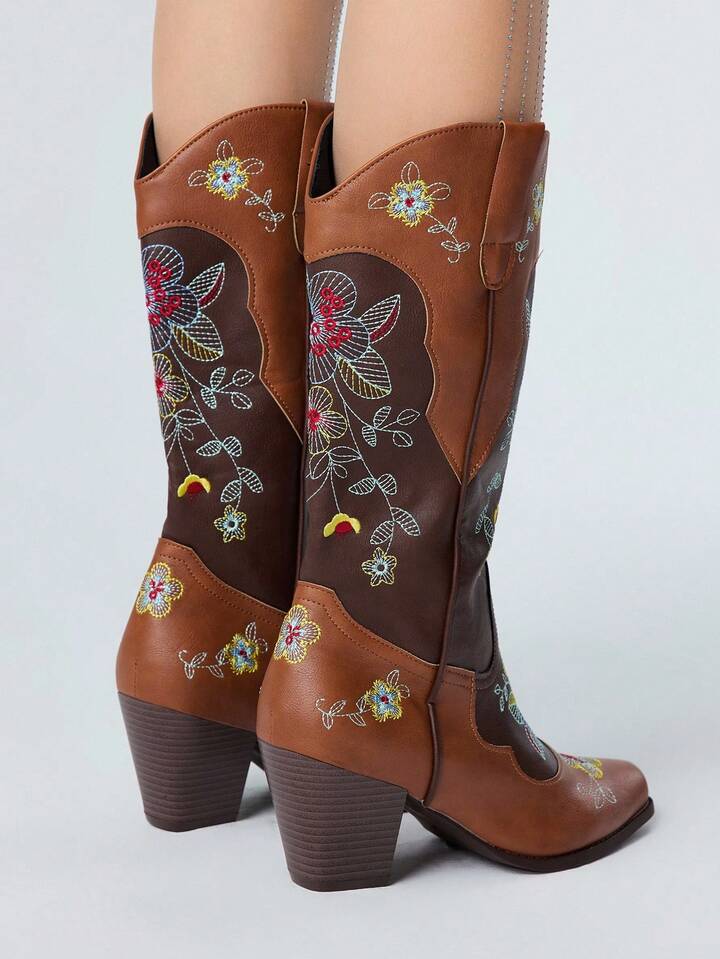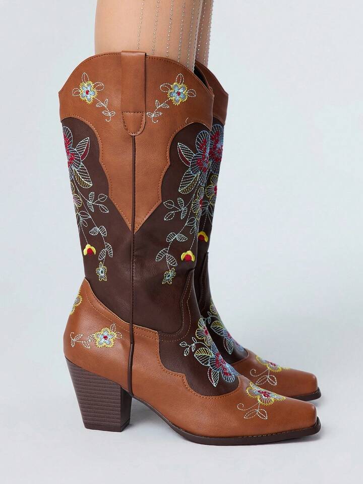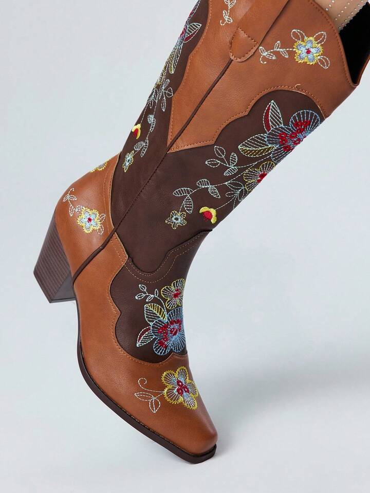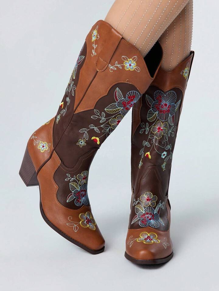 Fairycore بوت كاوبوي نسائية للخريف مع ميزة الارتداء السهل، تصميم ألوان متباينة، تفاصيل تطريز بنقوش زهرية، بطراز غربي، بوت كاجوال متوسطة الساق للخارج