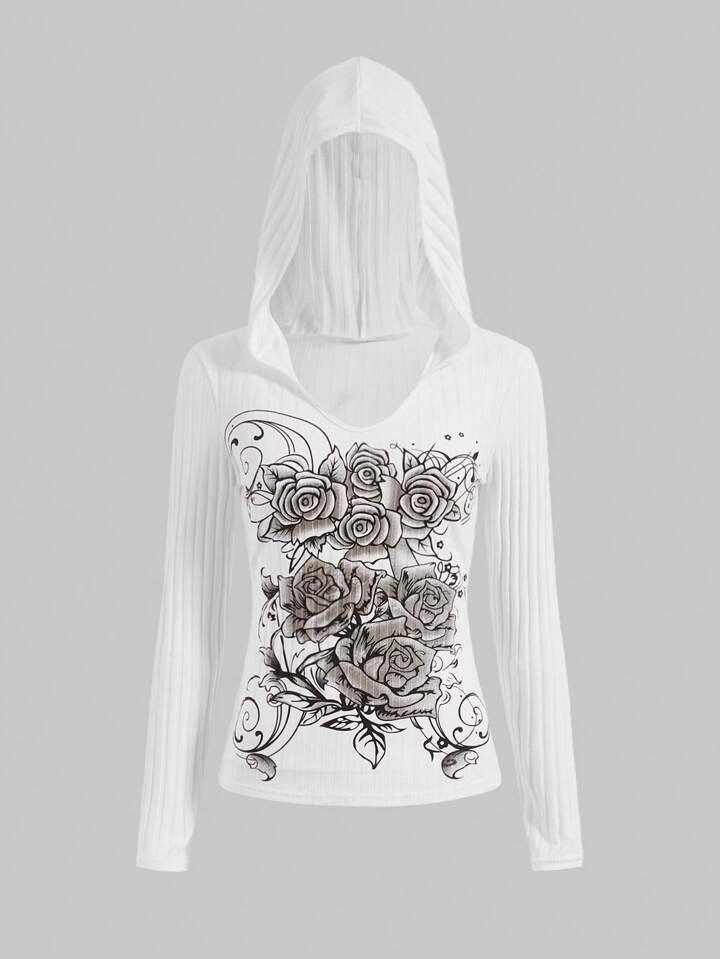 Fairycore تي شيرت مقنع بطباعة زهرية للنساء، مدرسي