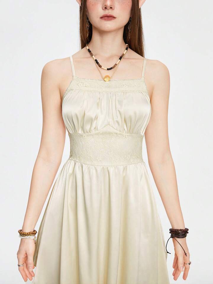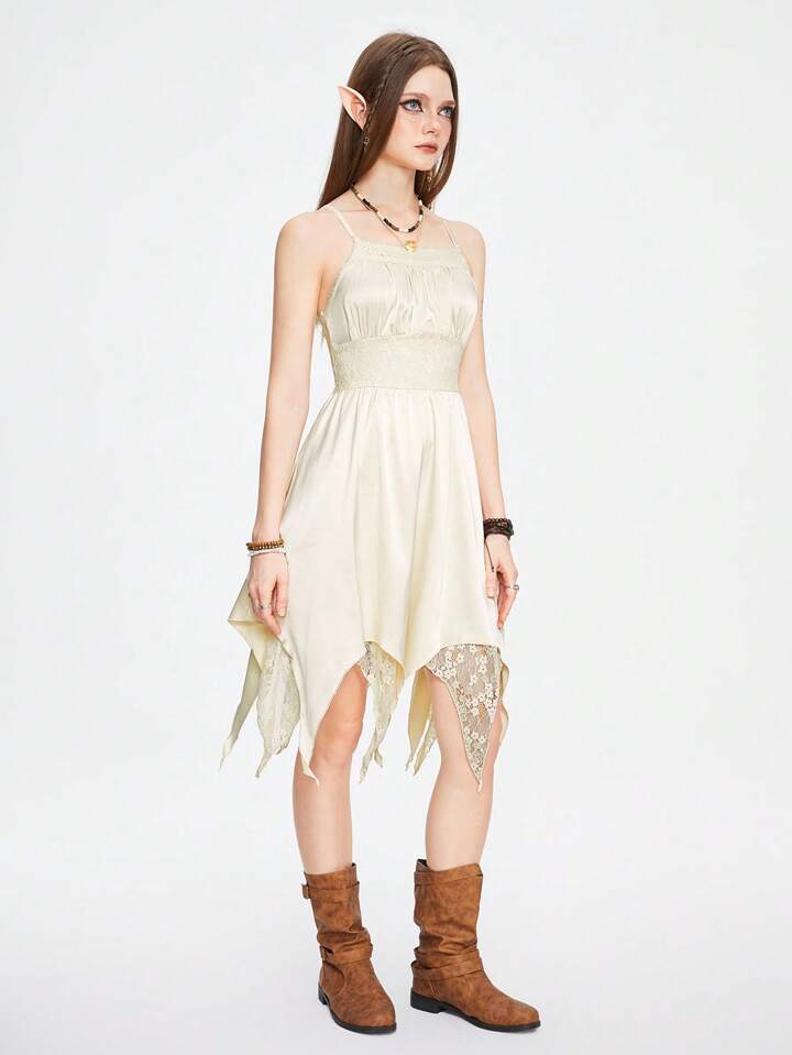 Fairycore فستان نسائي أنيق من الساتان والدانتيل مع حافة غير متماثلة