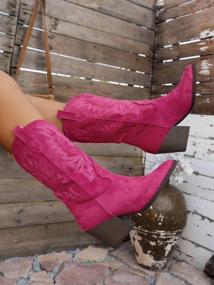 Fairycore بوت كاوبوي نسائية عالية الكعب بزخارف مطرزة ذات تصميم مدبب للقدم على شكل حرف V، لون وردي، بوت منتصف الساق للموضة والاستخدام الخارجي