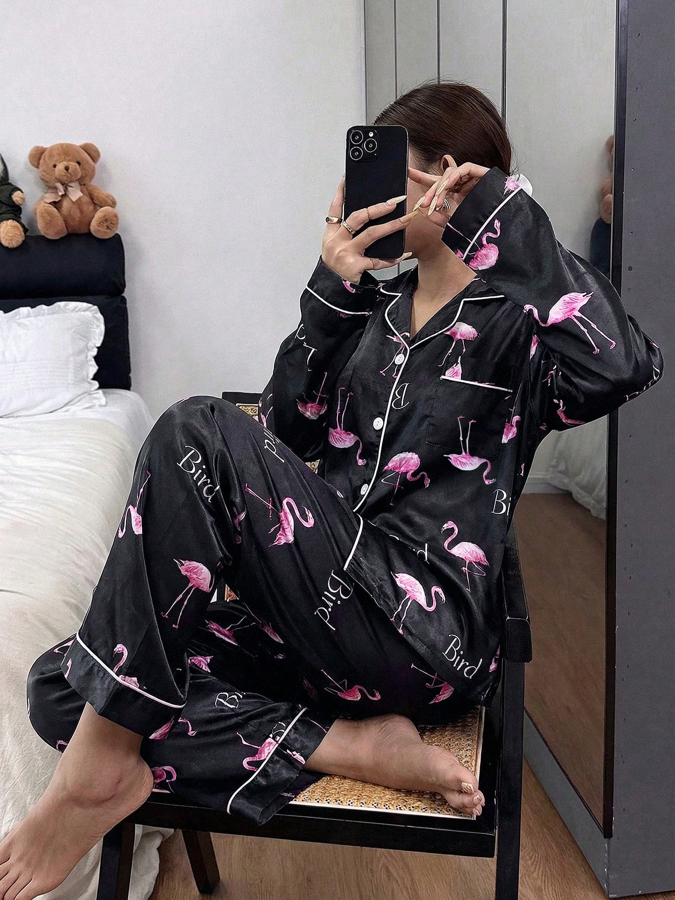 طقم بيجامة من السطح المطبوع بالفلامنجو والحروف مع تفاصيل أنيقة ودافئة للخريف والشتاء