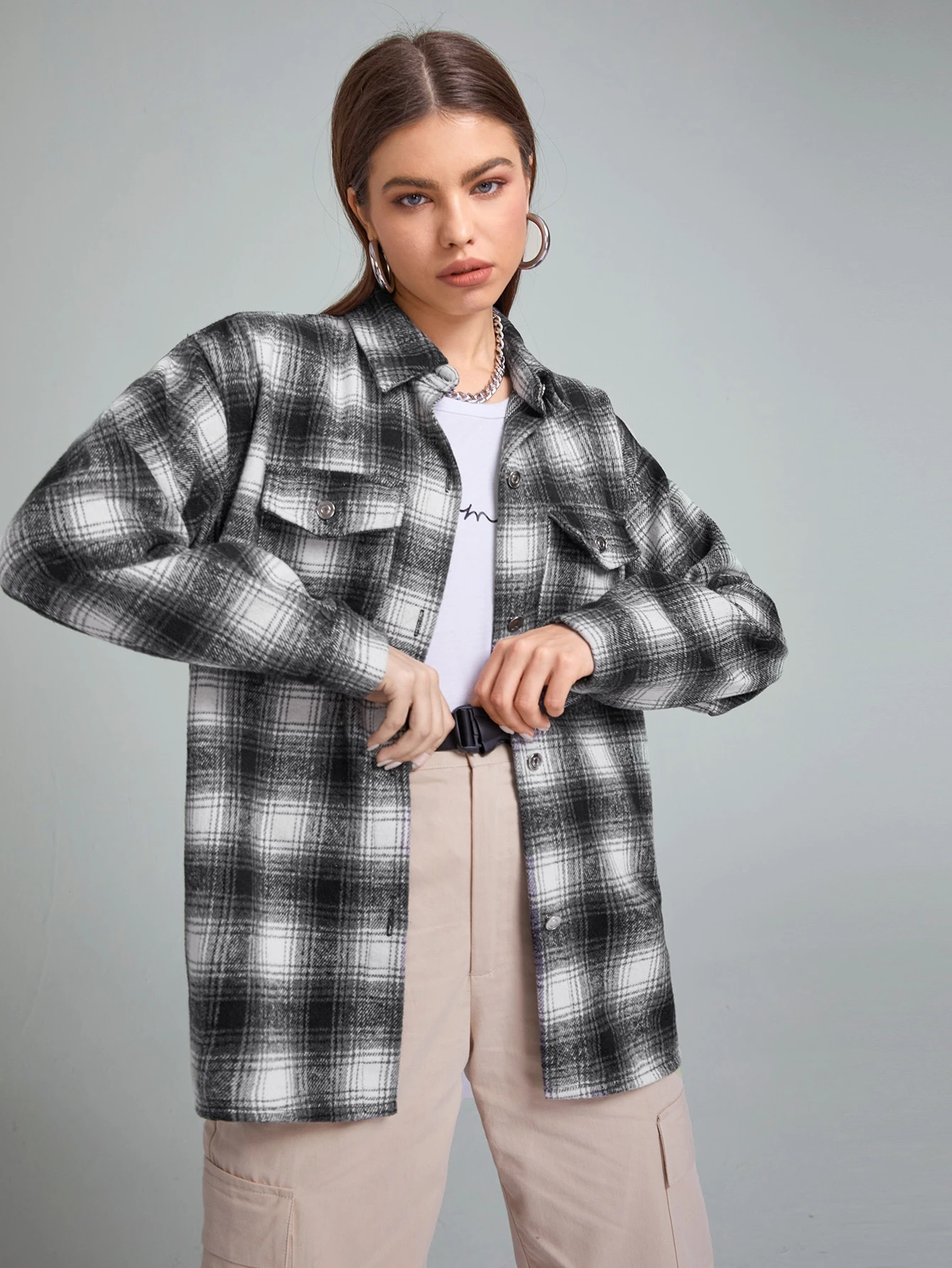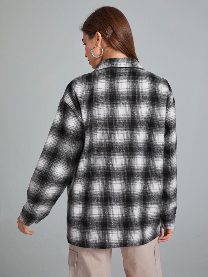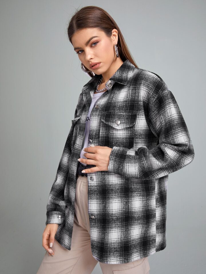 قميص كبير مربع النقش بجيب رفرف