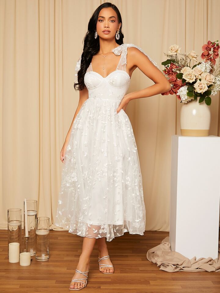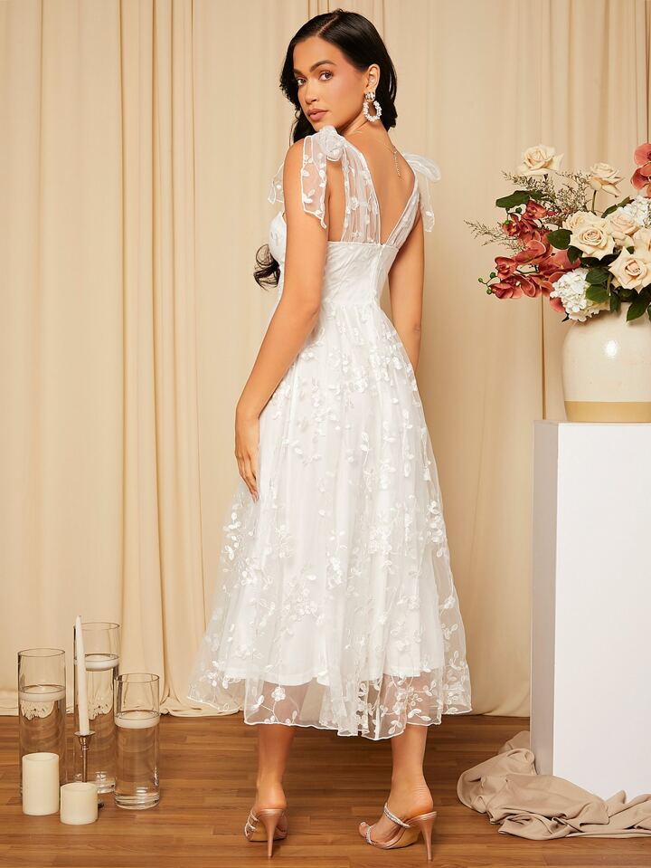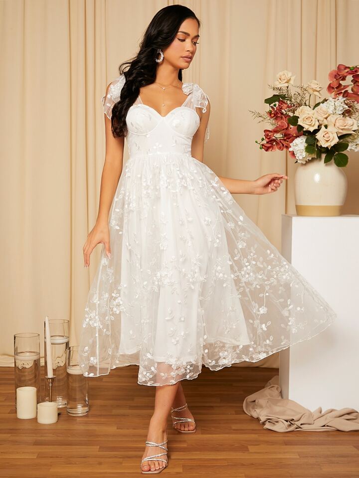 فستان زفاف أنيق مطرز بالزهور أبيض، فستان عرض العروس الأبيض، العروس