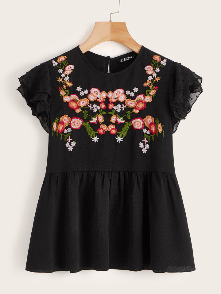 لباس علوي بكتف مكشكش و مطرز بالأزهار
