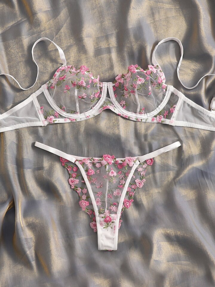 مجموعة ملابس داخلية من الشبك المطرز بالزهور، سيدة جذابة