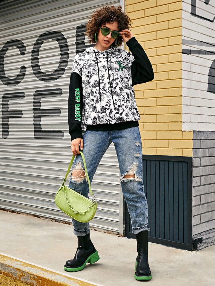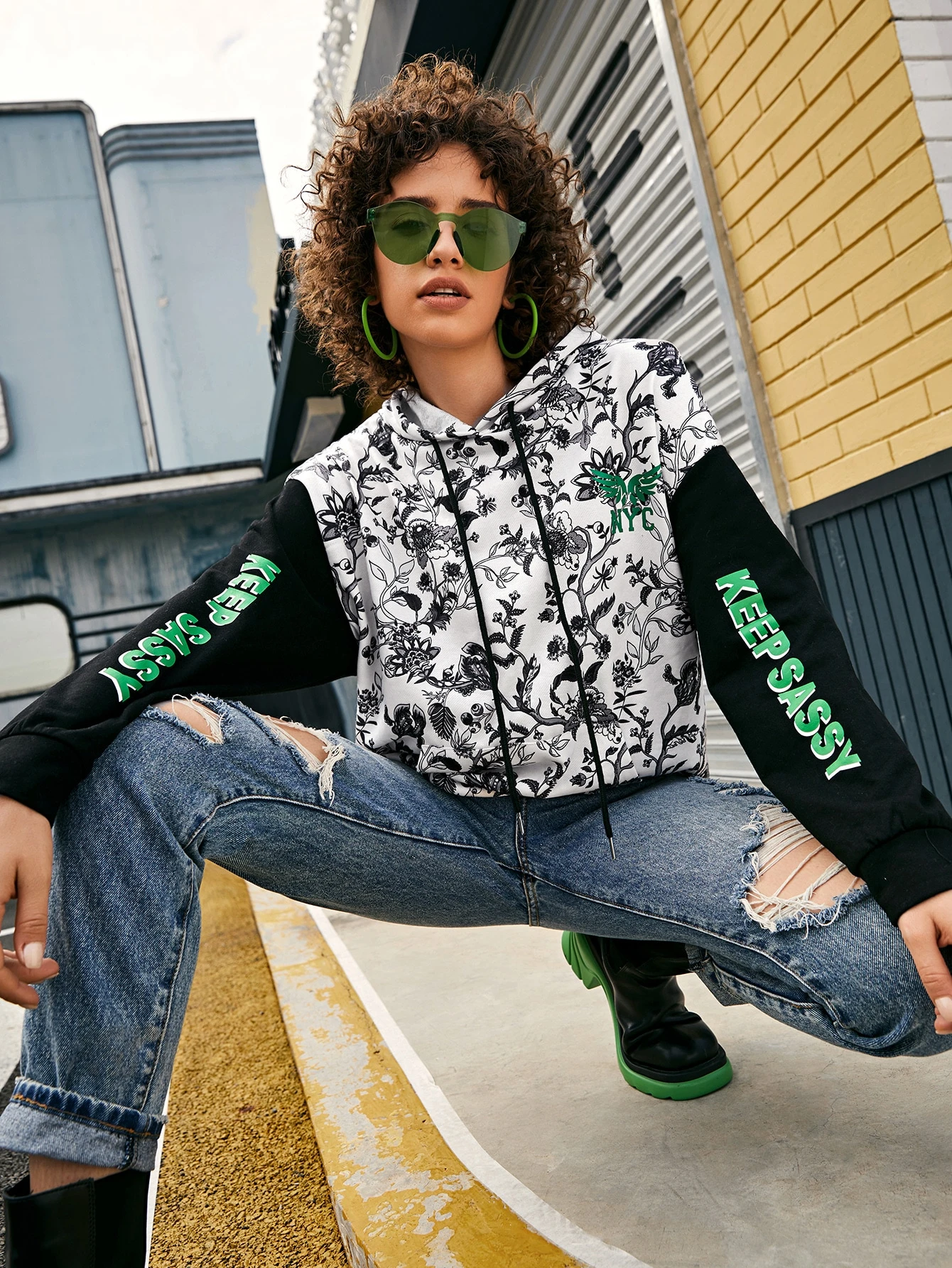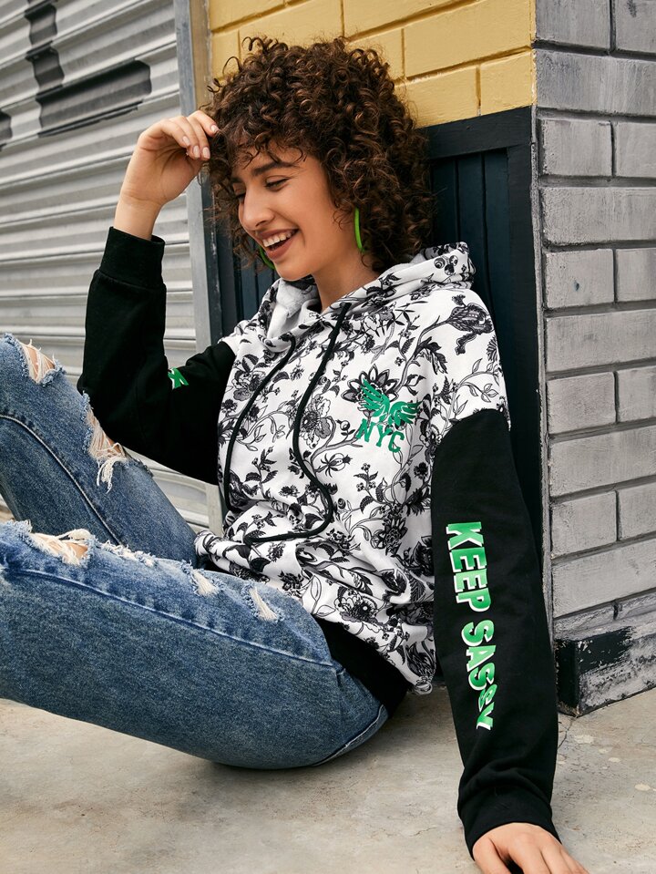 هودي بجرافيك زهر وعبارة منخفض الاكتاف