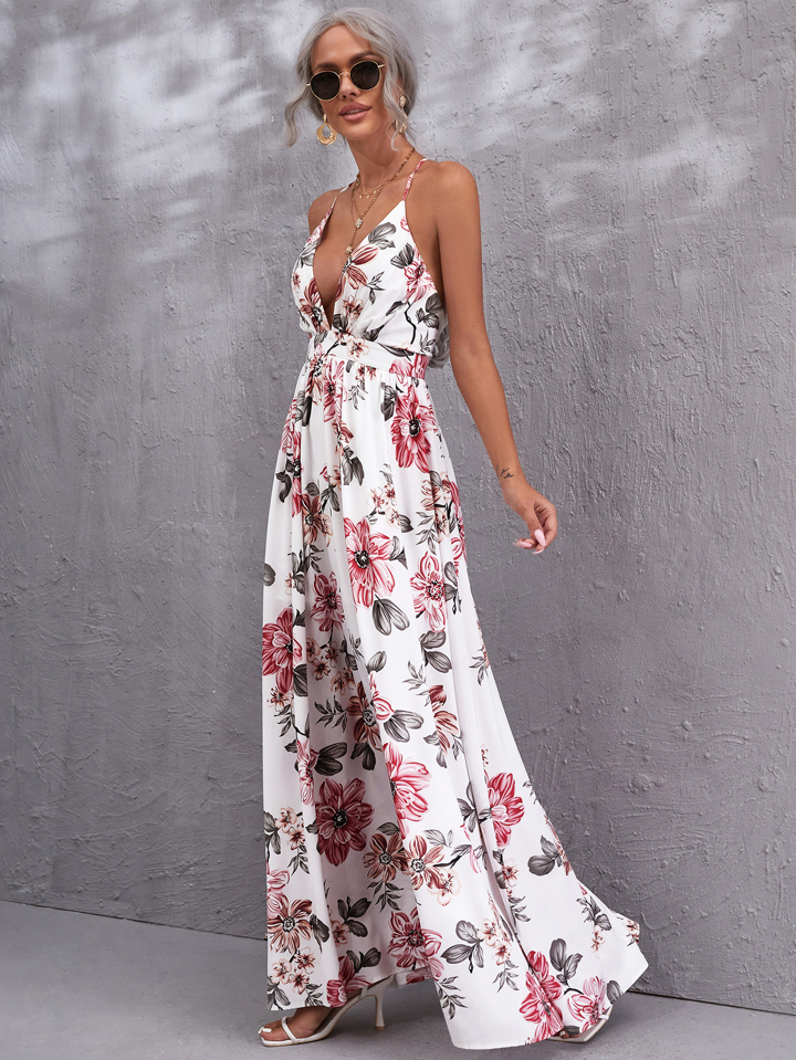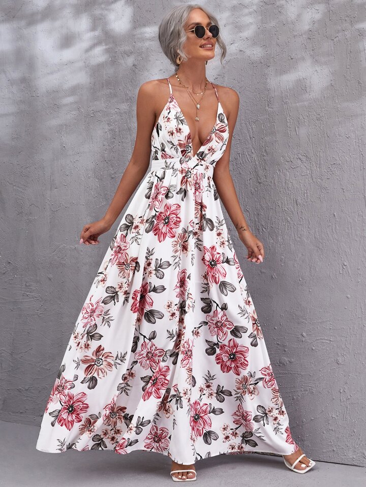 فستان كامي مكشوف الظهر متقاطع بعنق عميق ومزهر