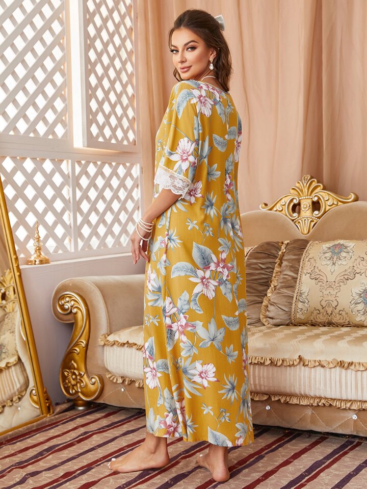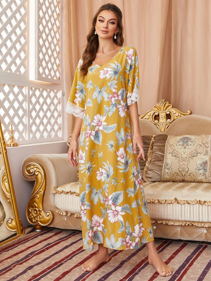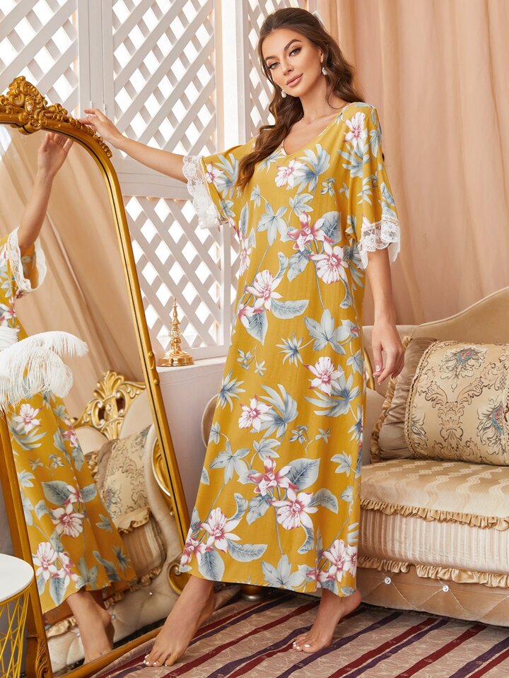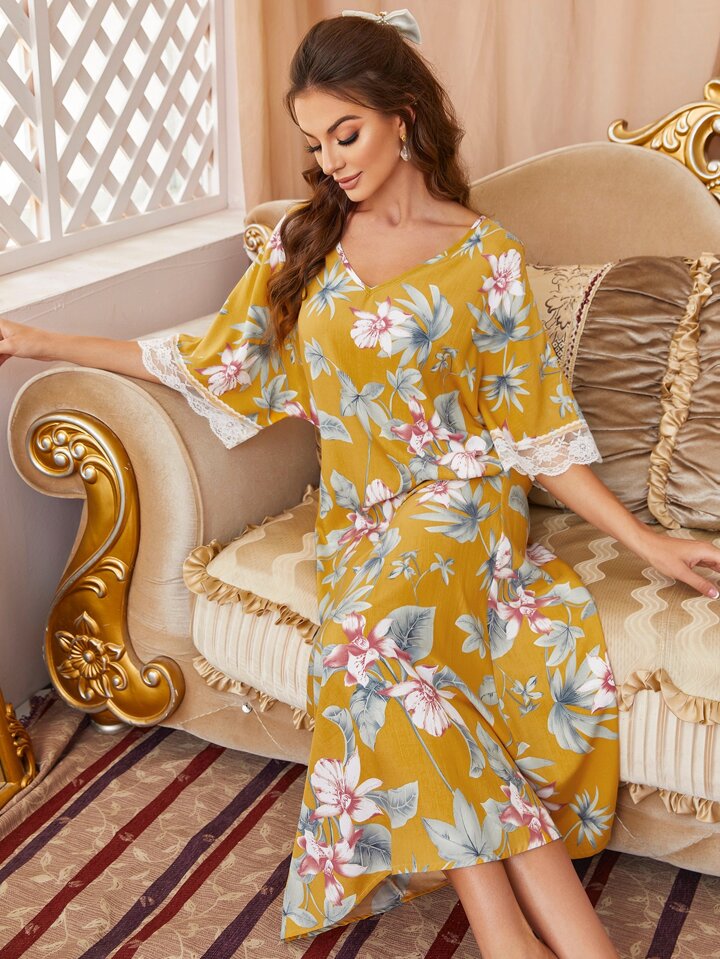 فستان نوم طباعة الأزهار دانتيل متباين اللون اكمام جناح خفاش