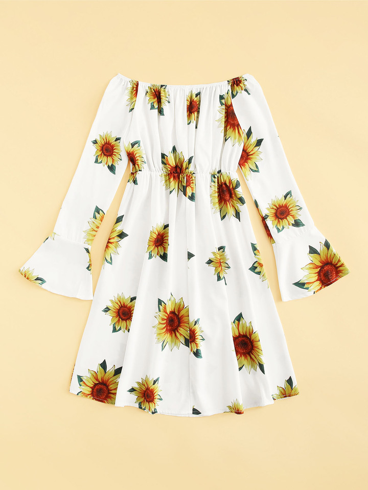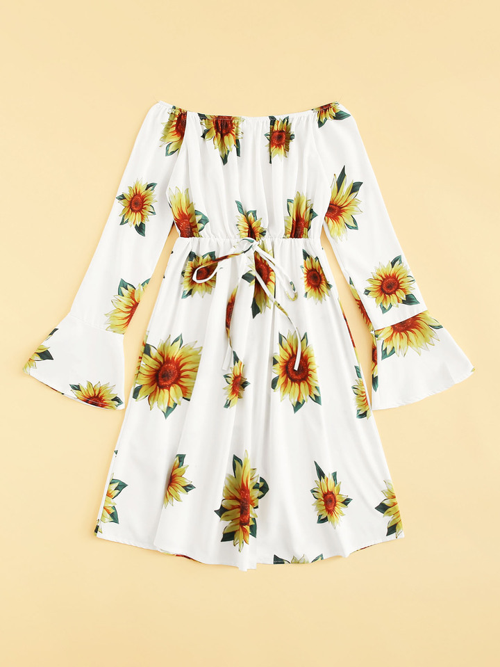 فستان بأكمام مكشكشة مع رباط خصر وطباعة زهري