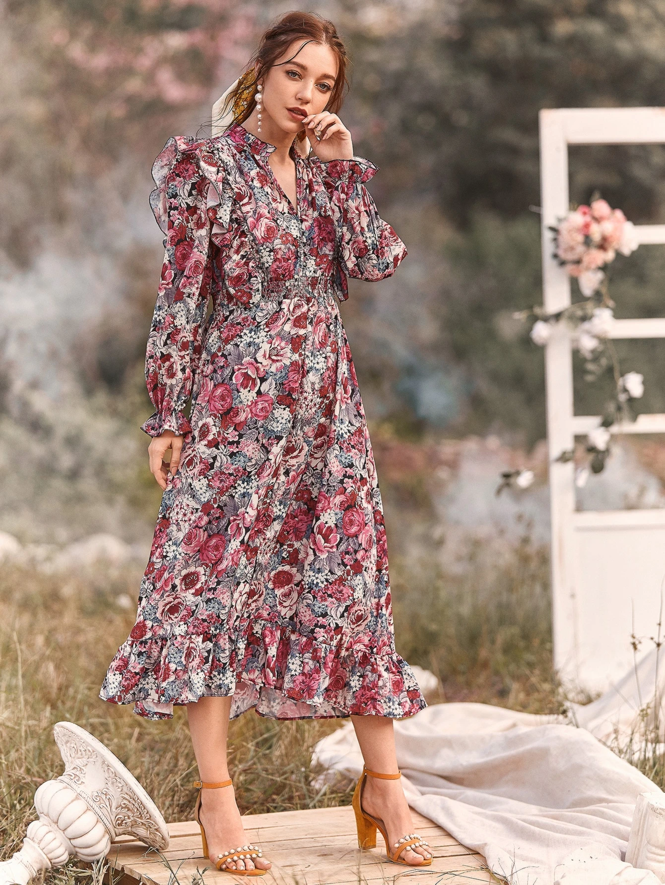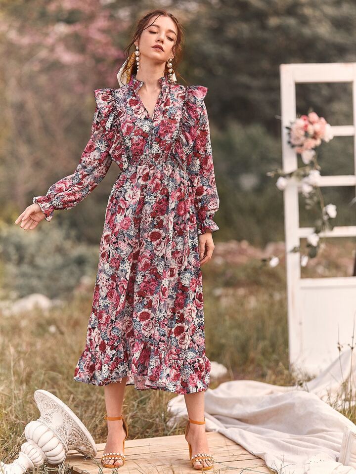 فستان مكشكش بعنق مسنن وبطباعة زهر