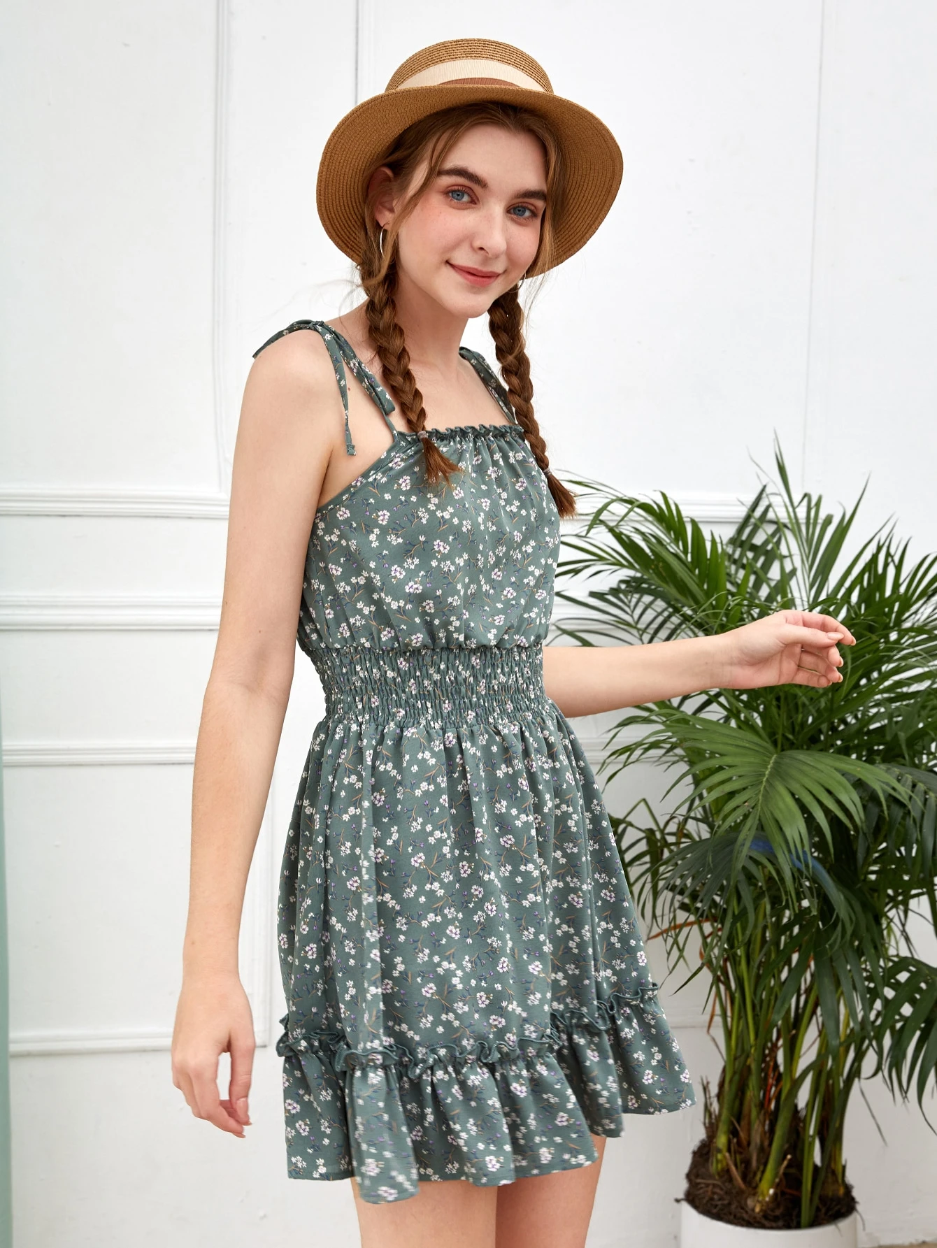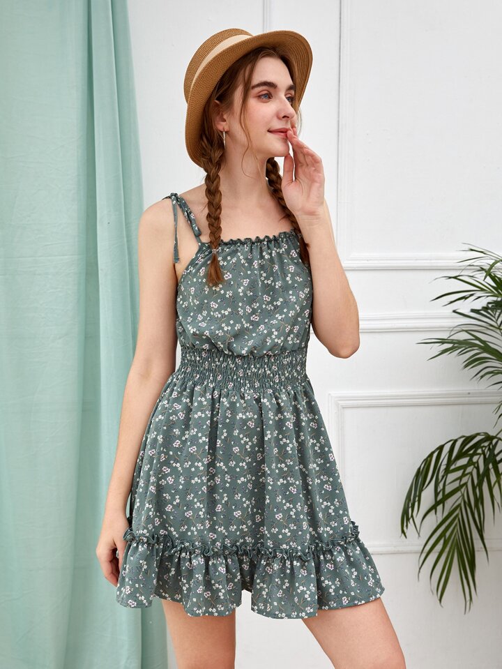 فستان كامي طباعة الأزهار بغرز حافة مكشكشة بربطة كتف