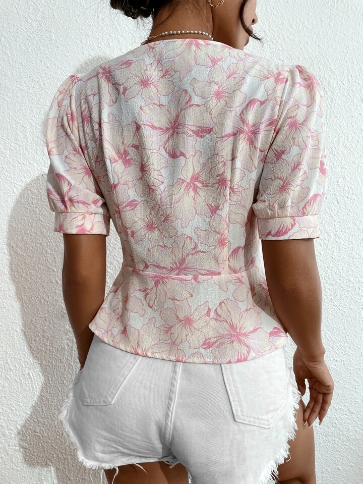 بلوزة بياقة مفتوحة شكل قلب واكمام منتفخة وطباعة زهور