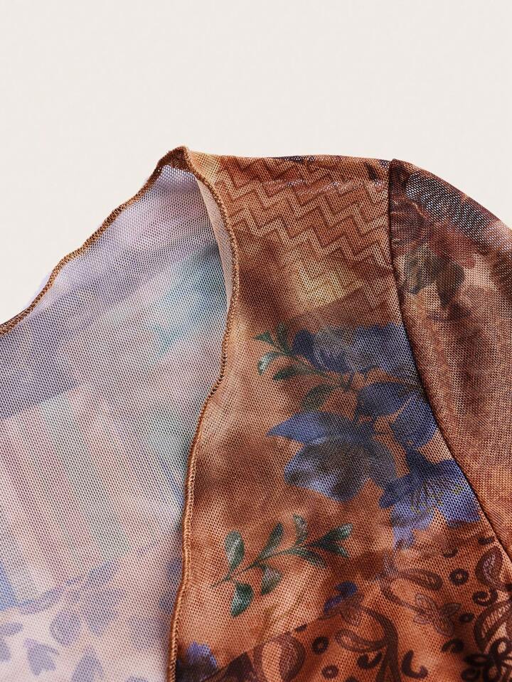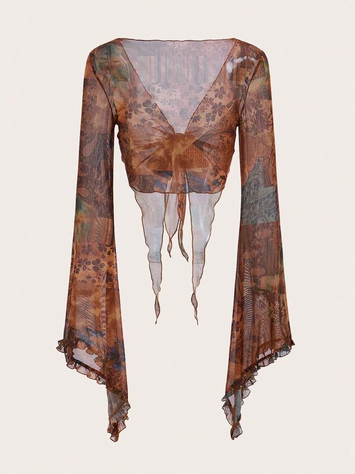لباس علوي طباعة الأزهار ربطة امامية اكمام على شكل بوق شبكة