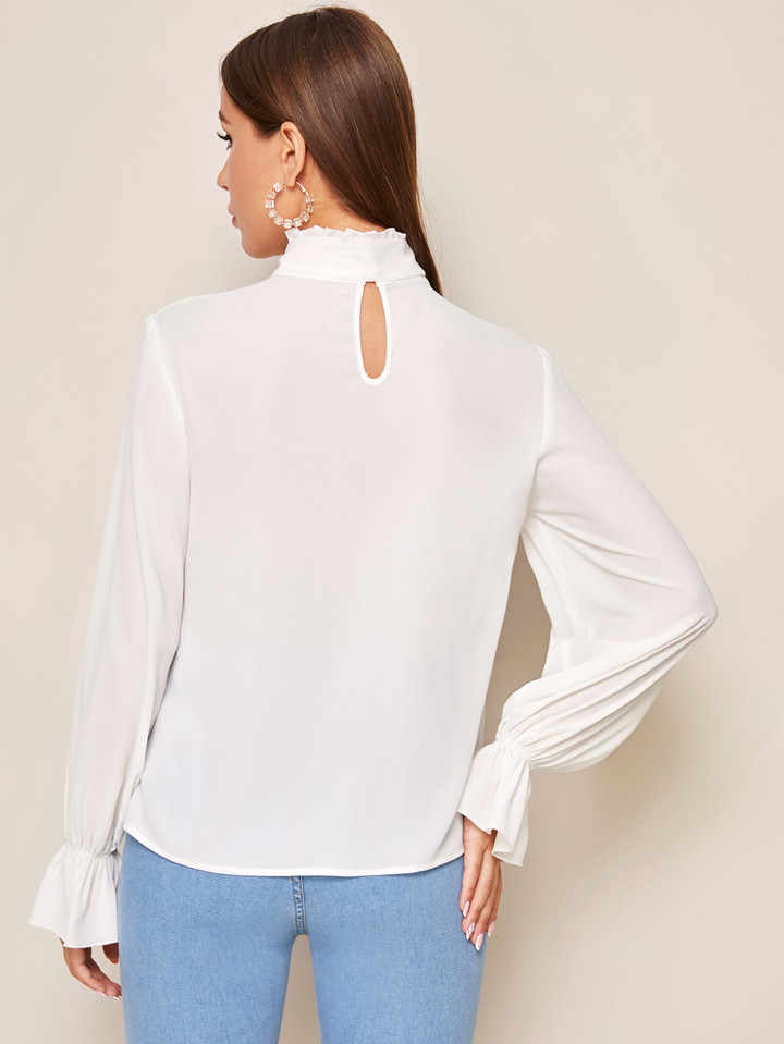 لباس علوي اكمام منتفضة مزينة بشريط دانتيل مزركش بربطة عنق ملابس العمل