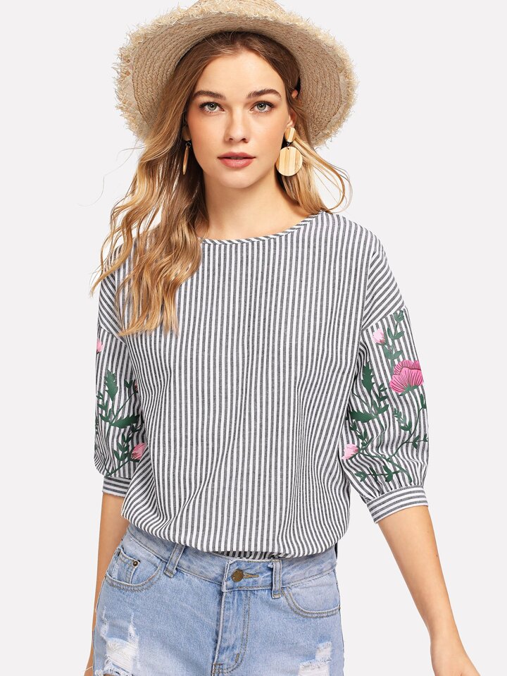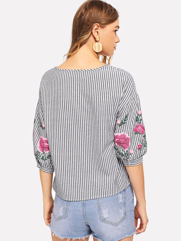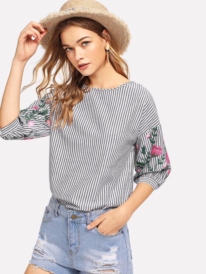 بلوزة مخططة مع أكمام فانوس بطبعات زهور