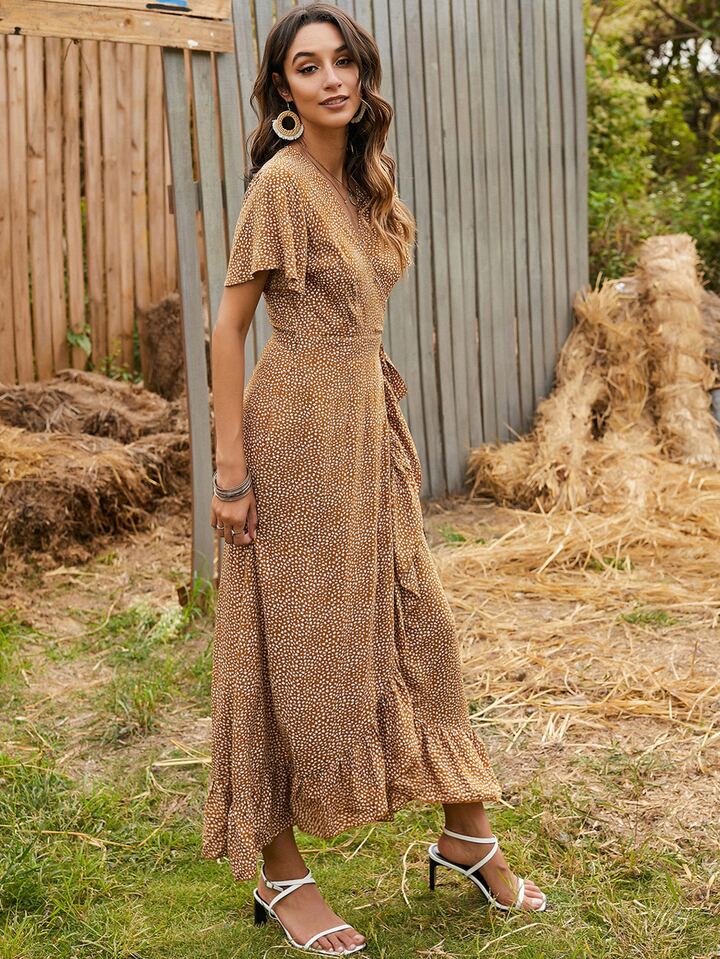 فستان بطباعة شامل مطوي ومكشكش باكمام رفرف
