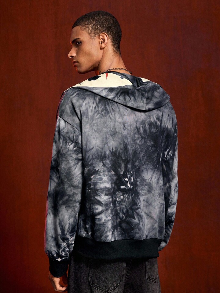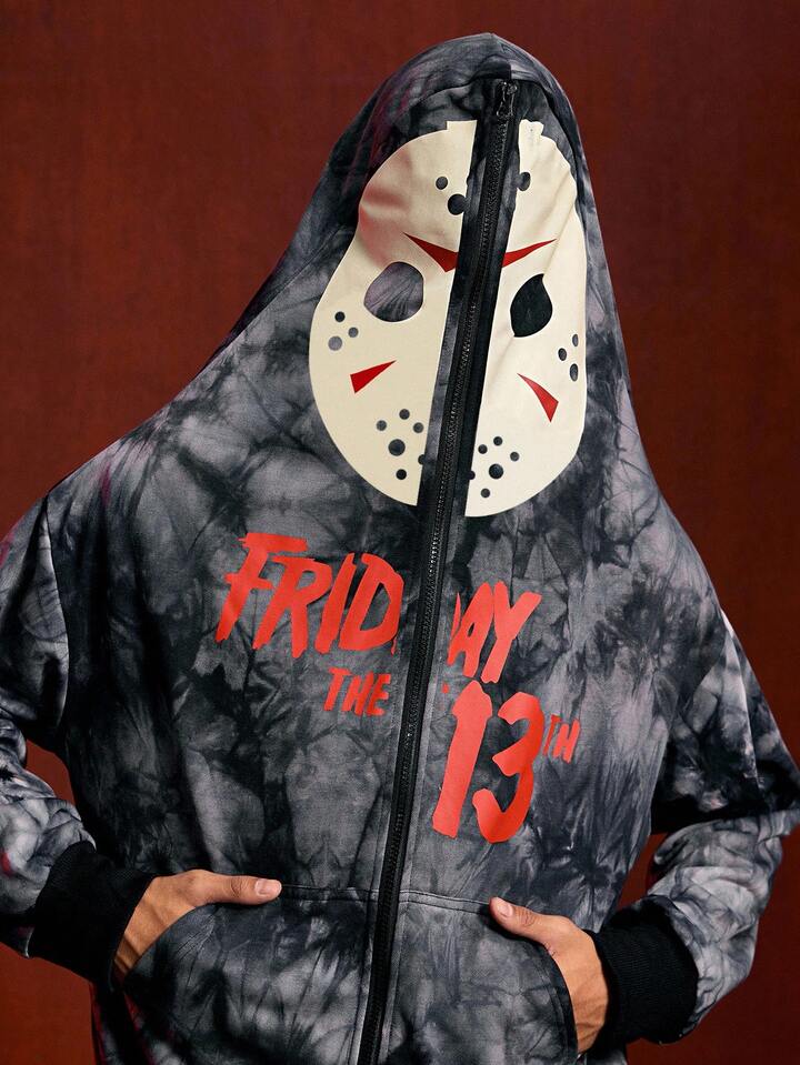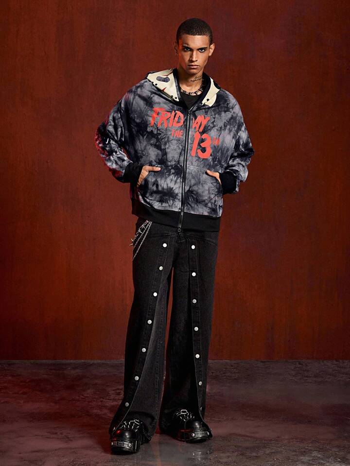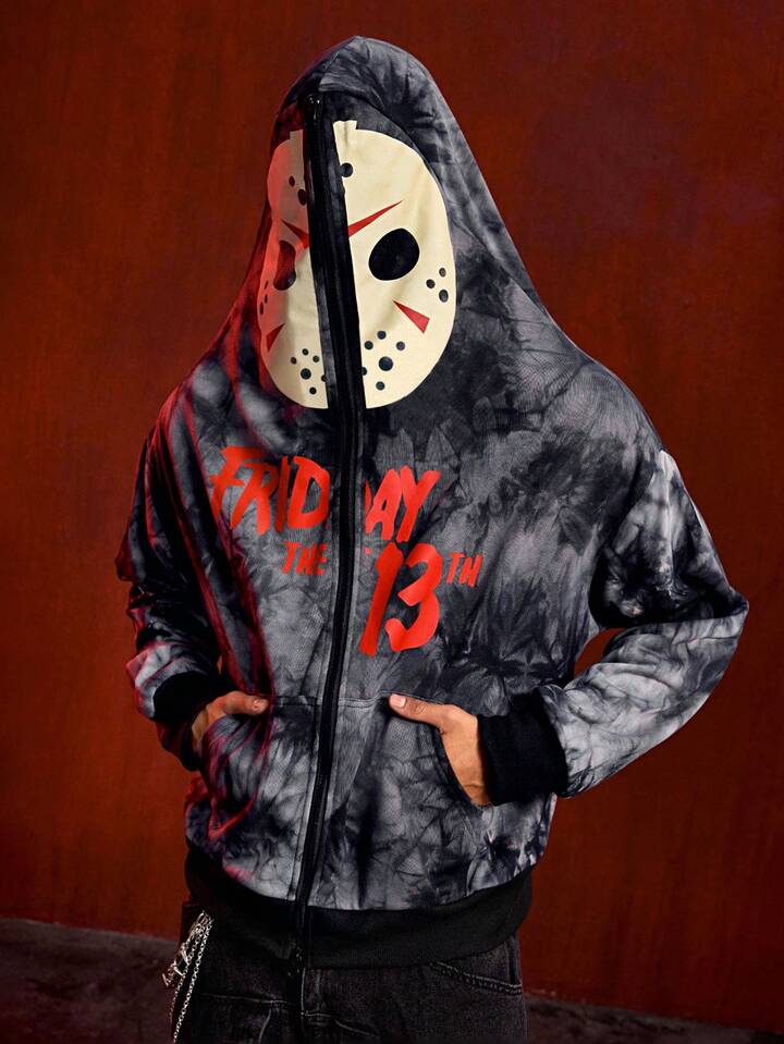 Friday the 13th X ROMWE هودي رجالي بسحاب وطباعة حرفية بتأثير صبغ التعتيق للخريف