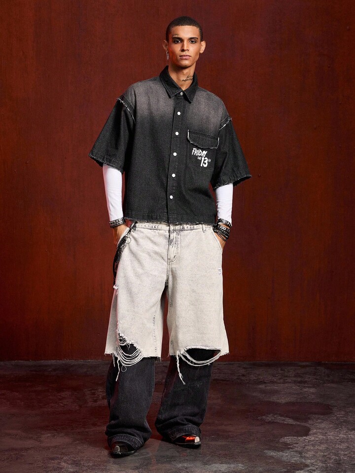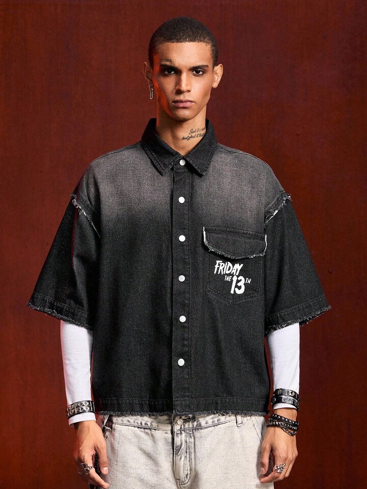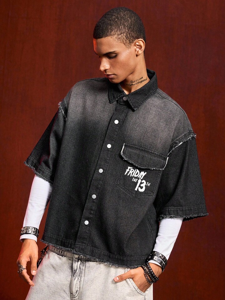 Friday the 13th X ROMWE قميص جينز مطبوع عليه حرف وقناع، مغسول بحافة خشنة وجيب قابل للطي للرجال