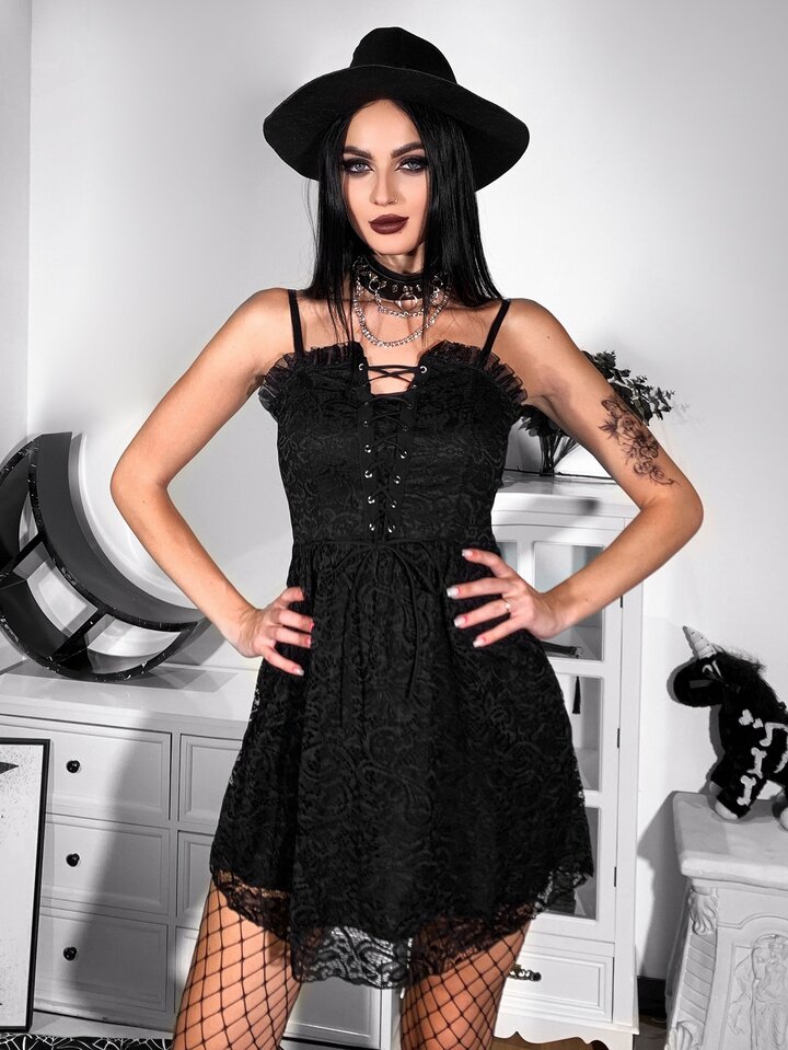 فستان كامي بدانتيل وبرباط امامي مقلم بهدب