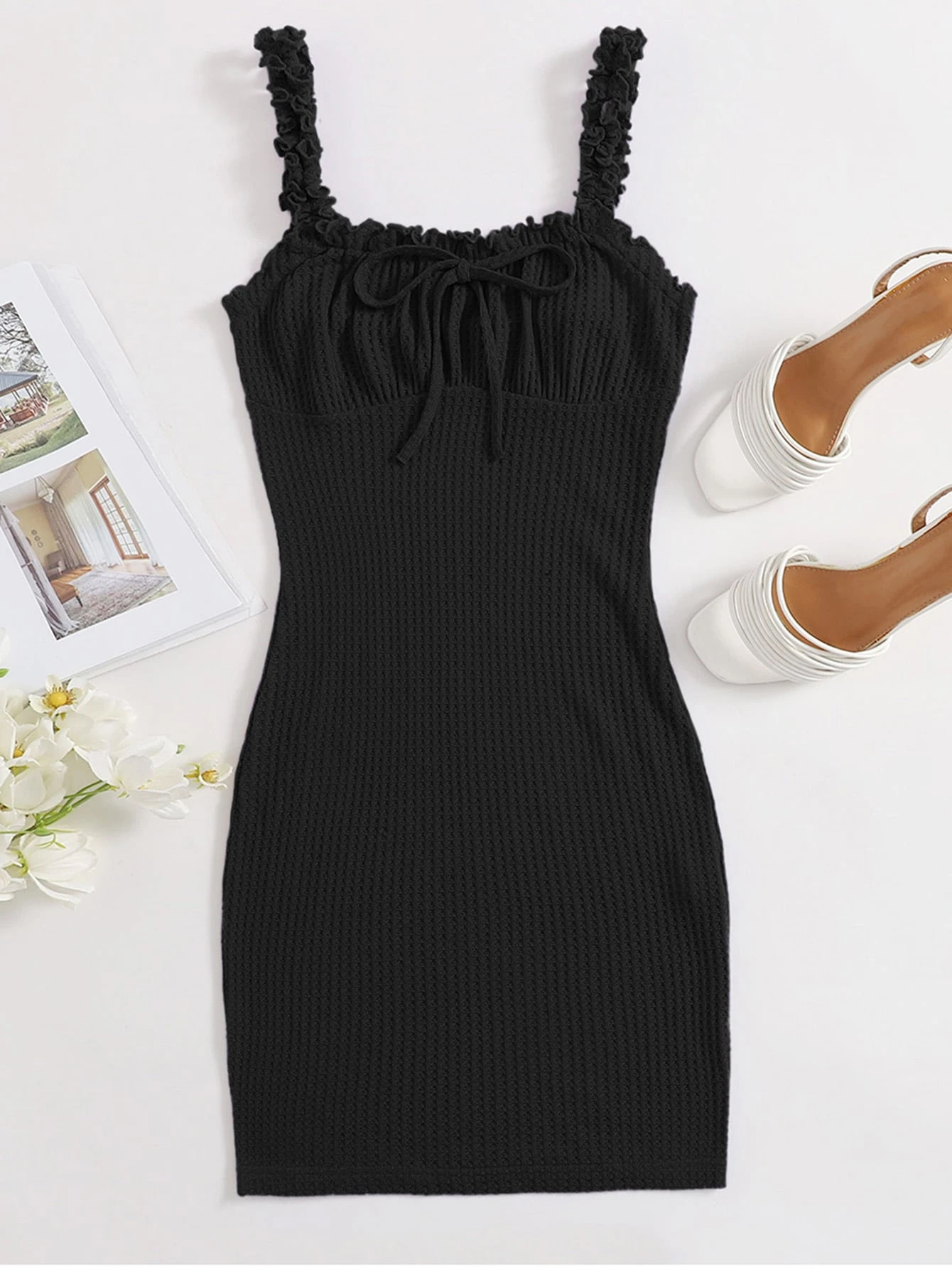فستان بطية صدر ومعقود امامي مع حمالات مقلم بهدب