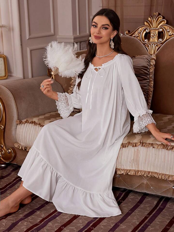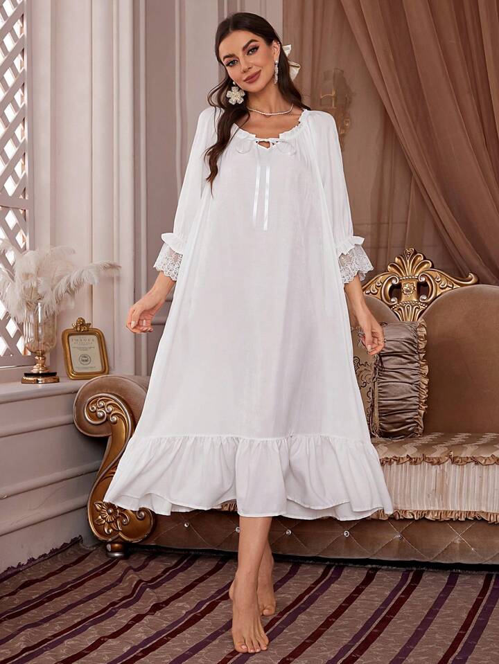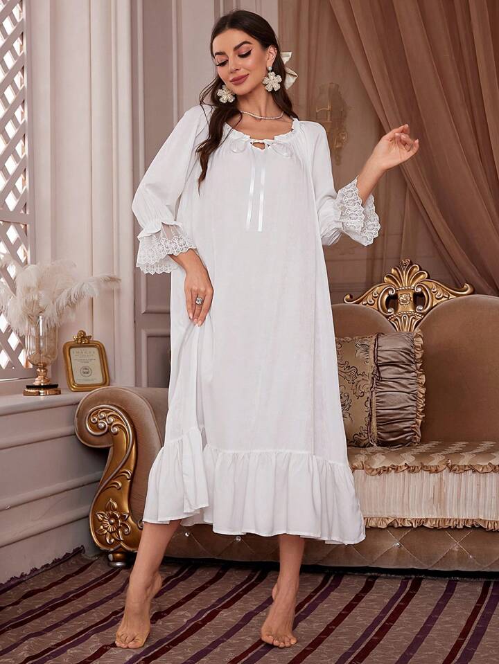 فستان نوم طويل بربطة عنق بتريمينج من الفريل والدانتيل بتباين اللون