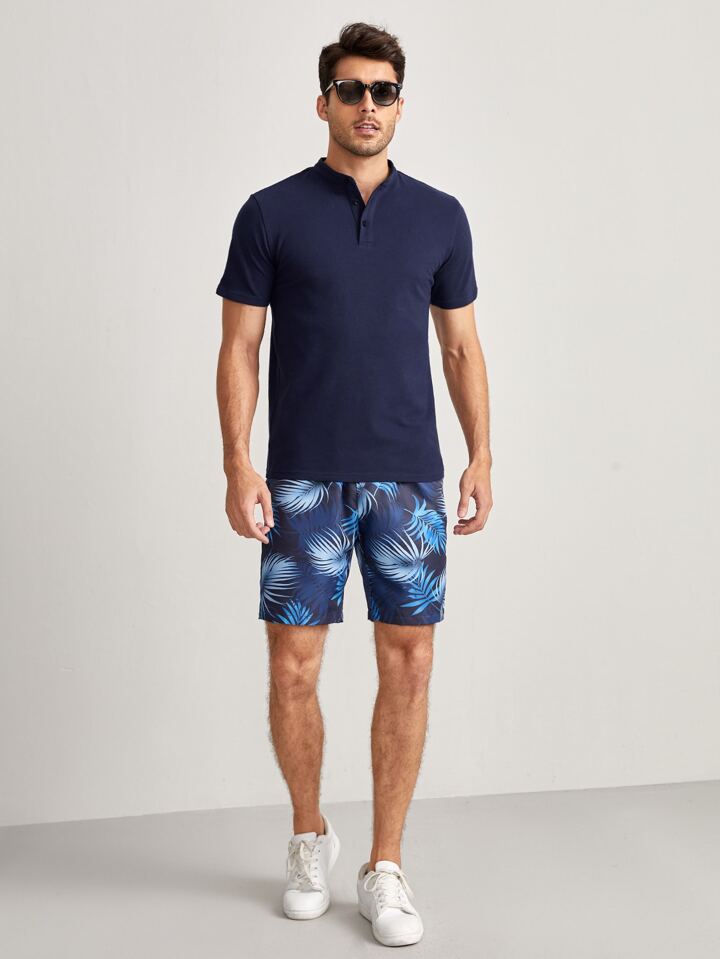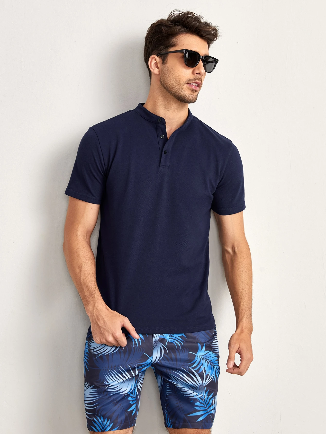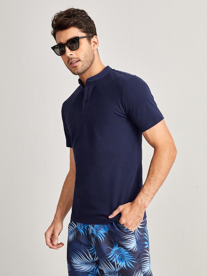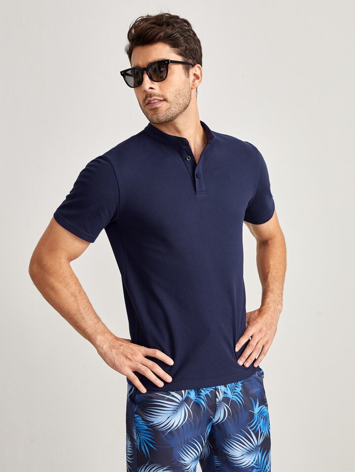 GENTILAND قميص بولو بلون أزرق داكن سادة، مع صدر رجالي وياقة موقفة مزركشة بأزرار، مناسب للعمل وللإطلالات الكاجوال