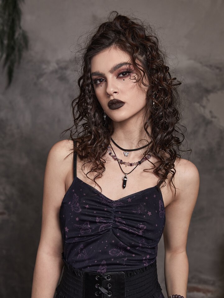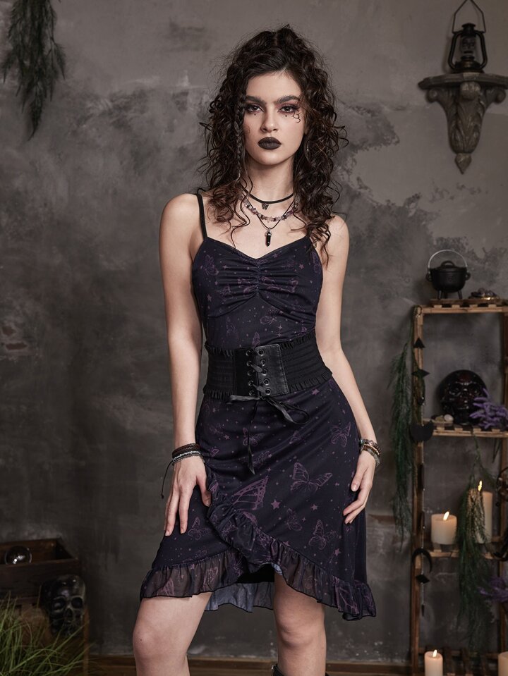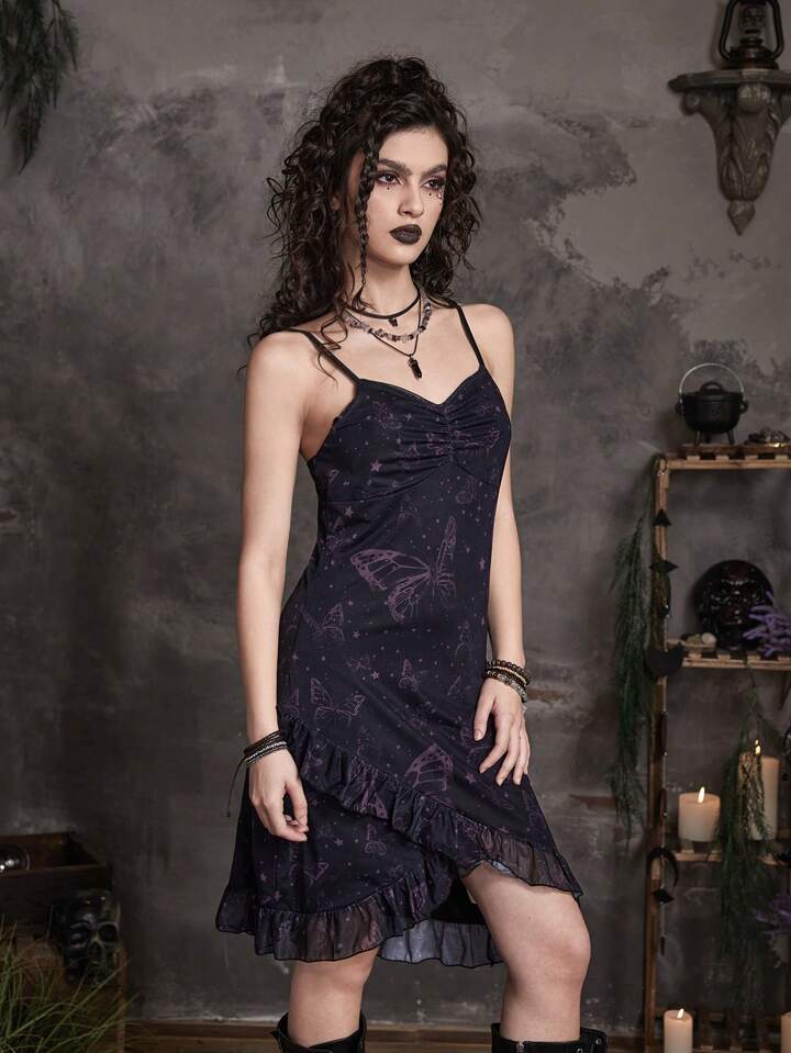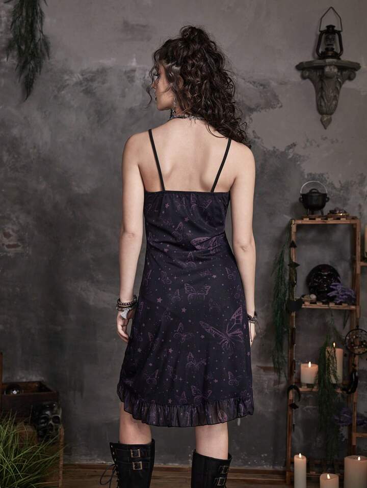 فستان كامي مجرة و بطباعة الفراشة حافة مكشكشة ثنية