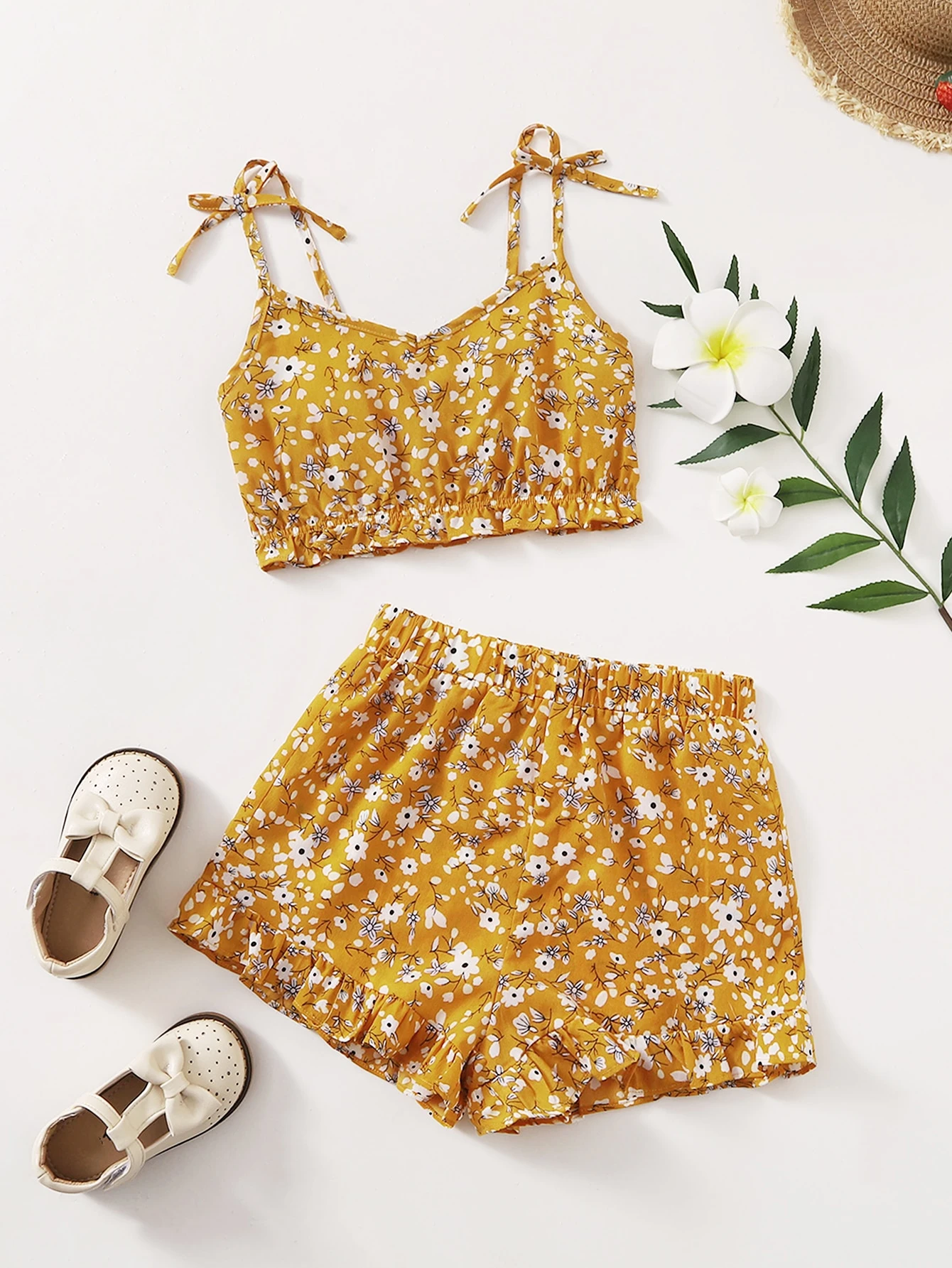 شورت مع لباس علوي كامي مقلم بكشكش بكتف معقود بطباعة زهر شامل للبنات