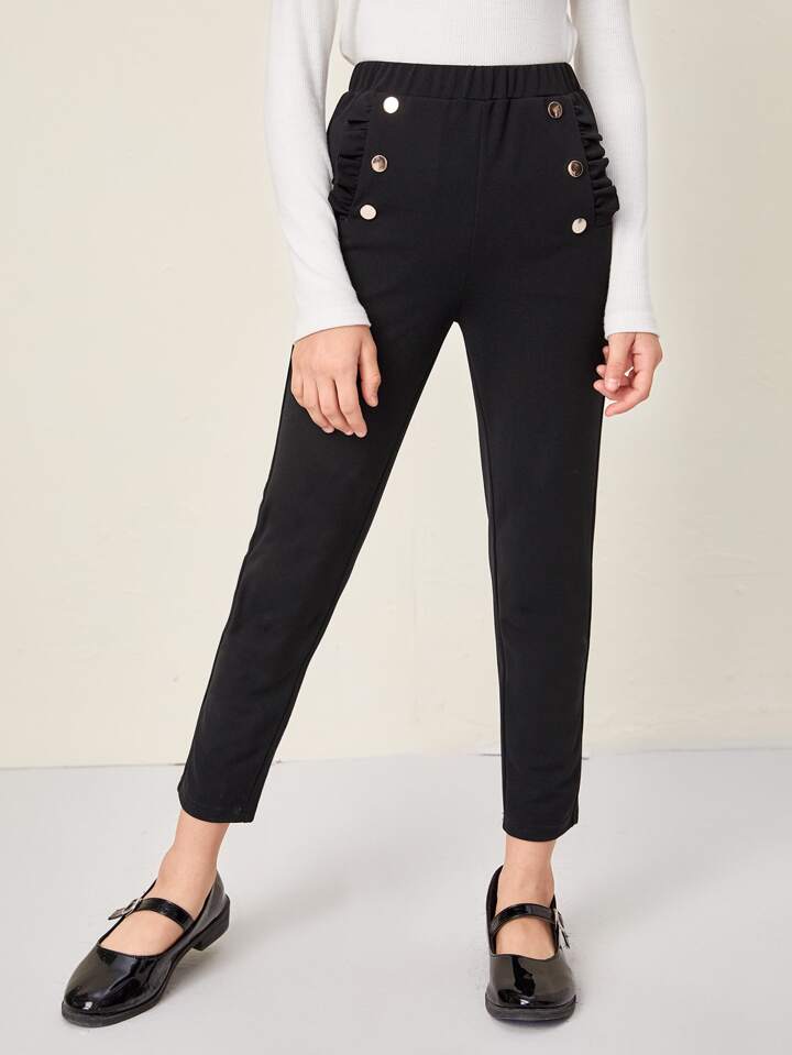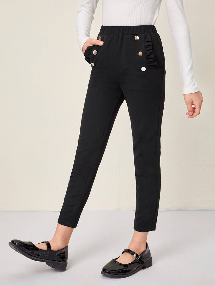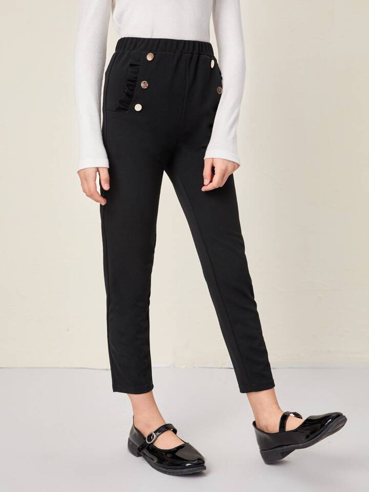 سروال بجيب مائل مقلم بهدب وبتفاصيل زر للبنات