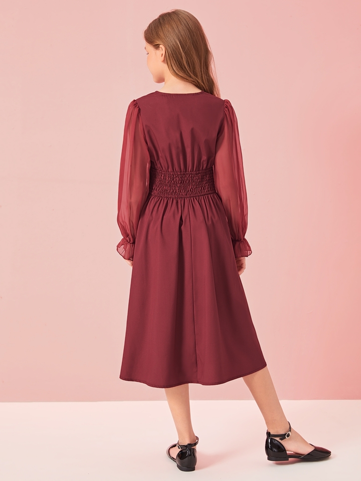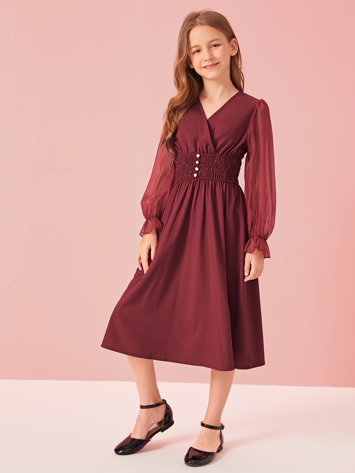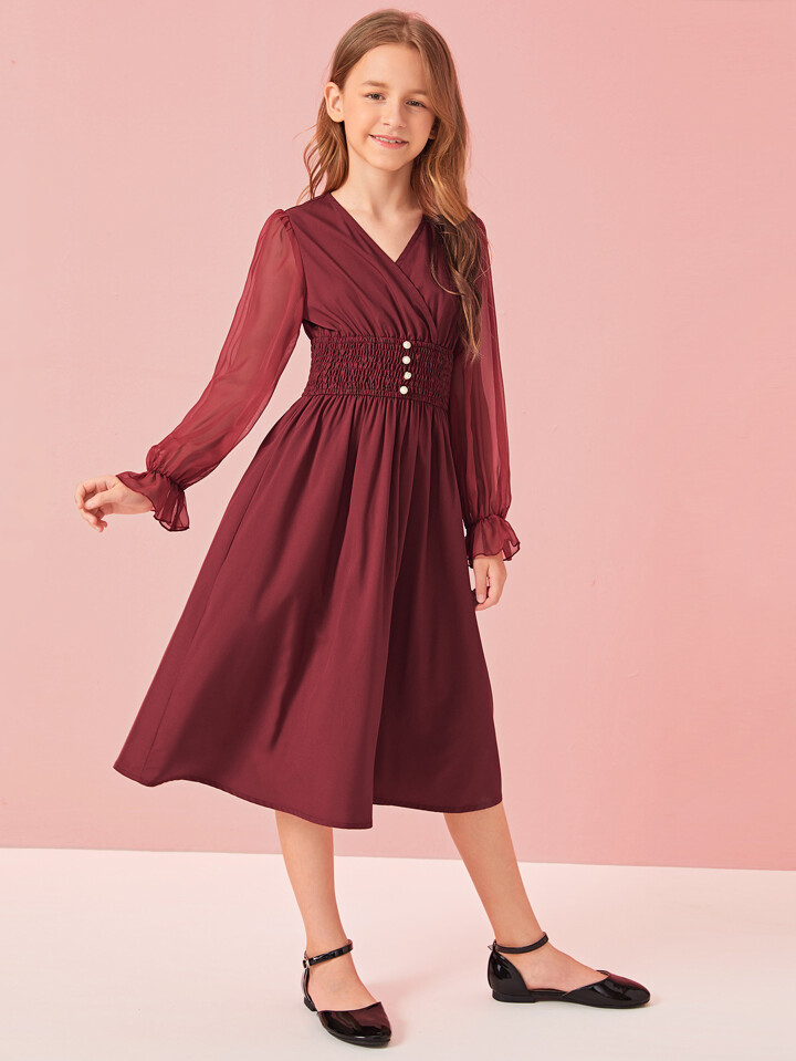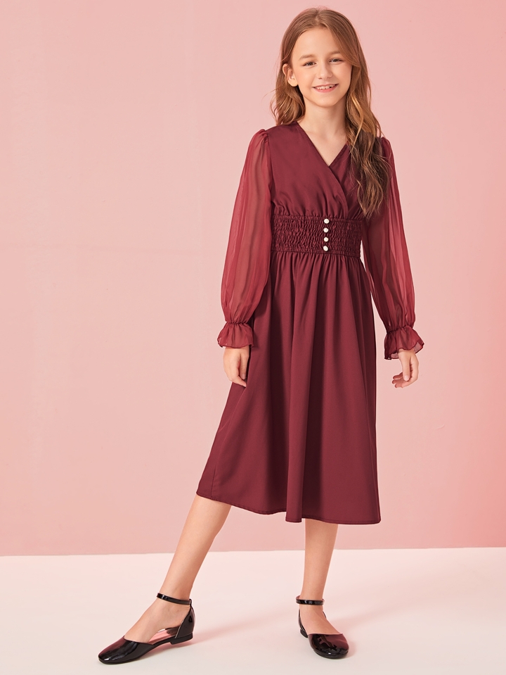 فستان بخصر مدرز مع أزرار وبأكمام شيفون للبنات
