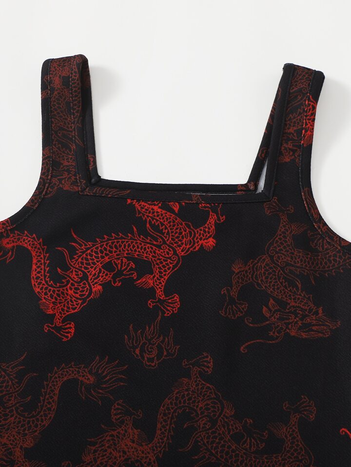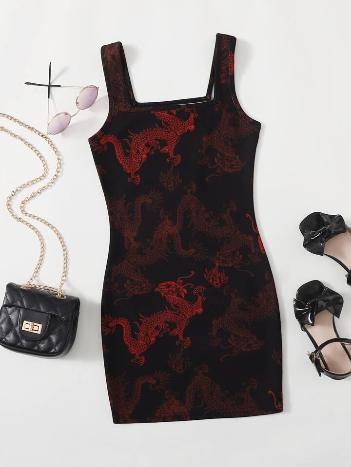 فستان ضيق بطباعة التنين الصيني للبنات
