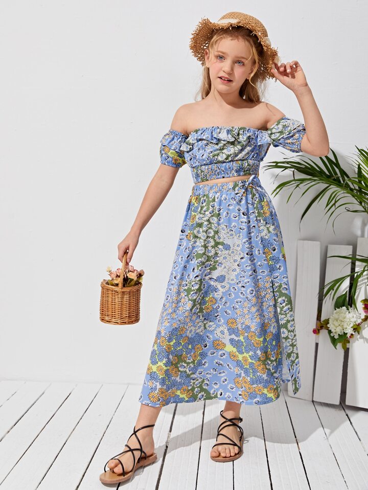 طقم تنورة بحافة فتحة مع لباس علوى بكتف مكشوف بزهر أقحوان للبنات